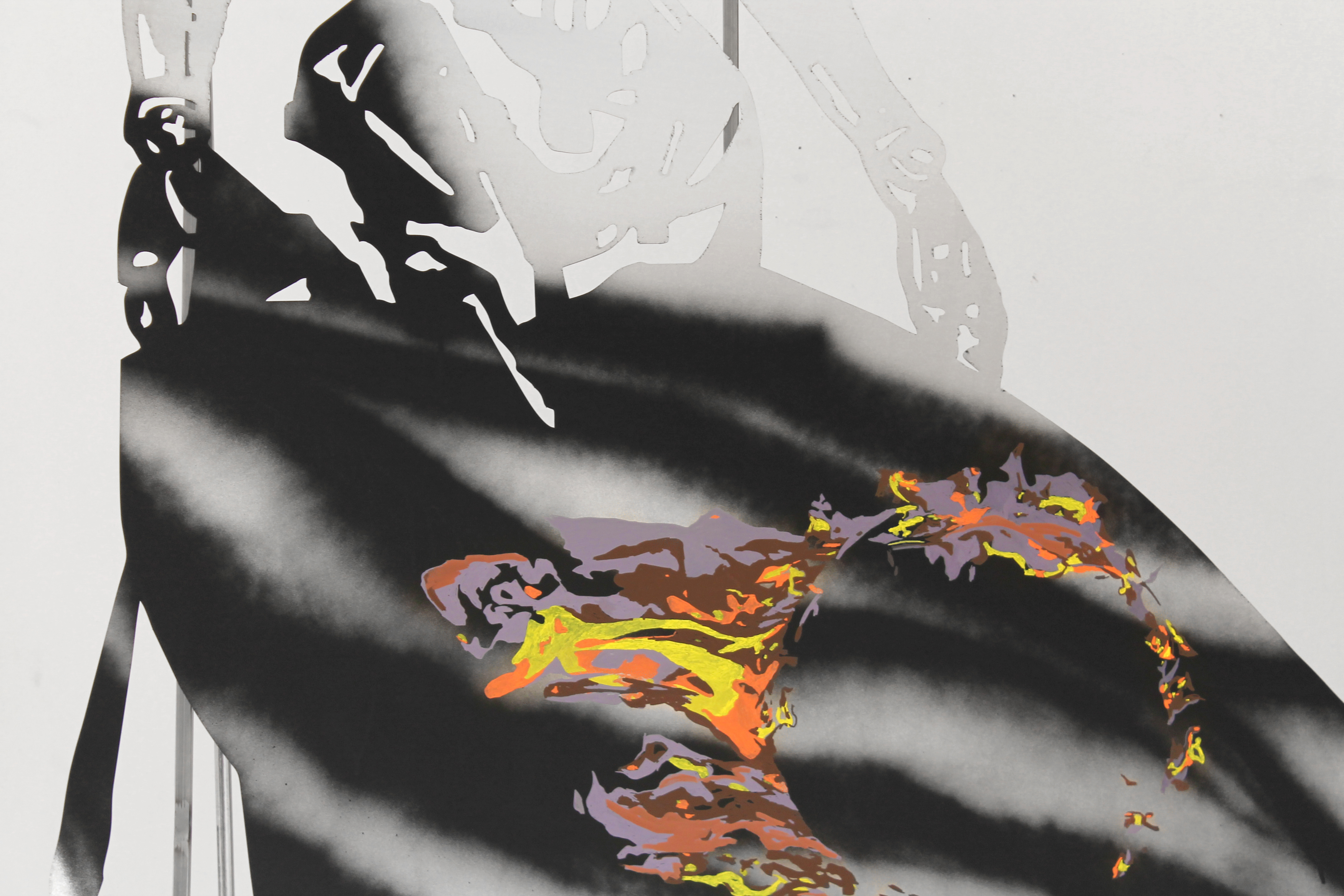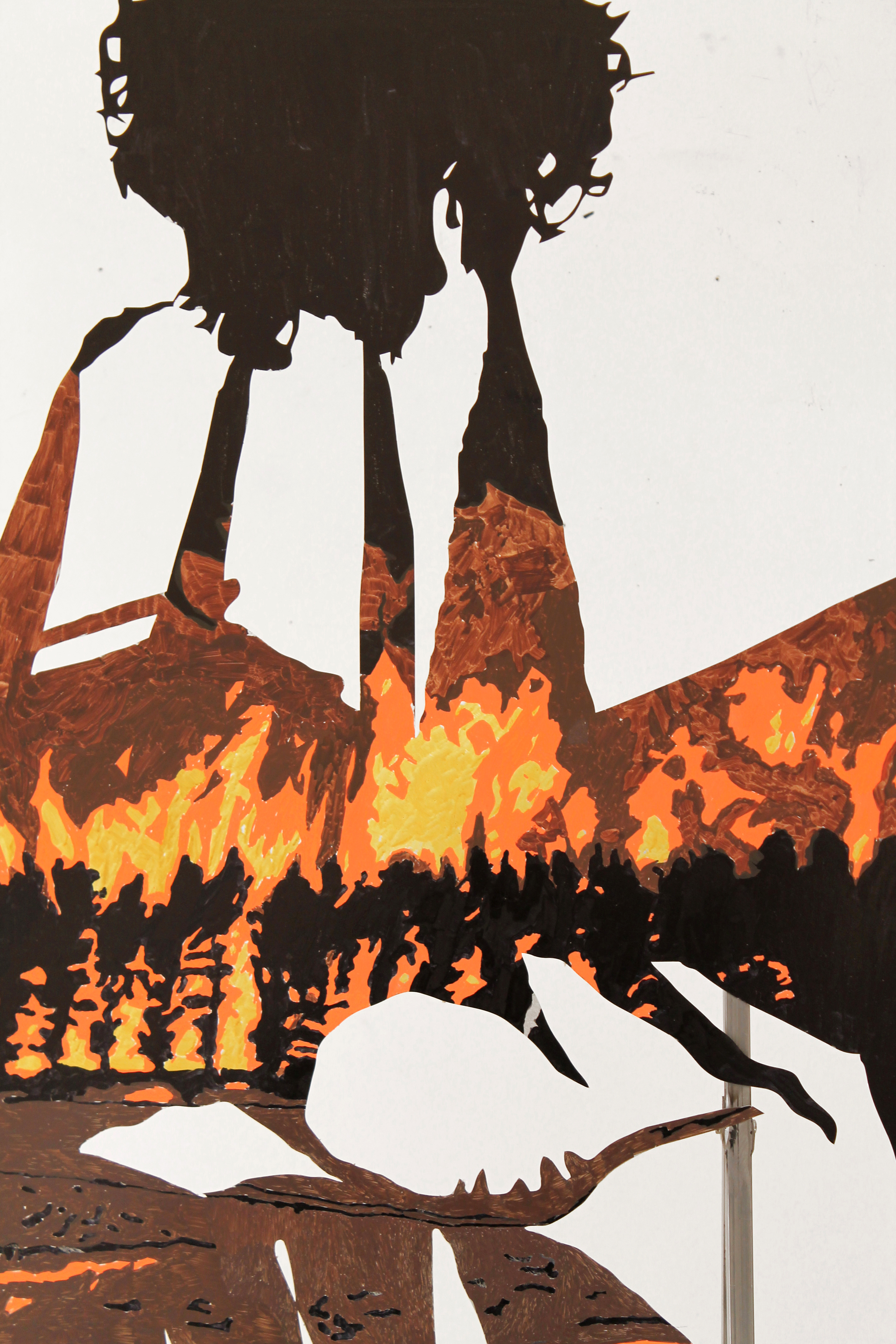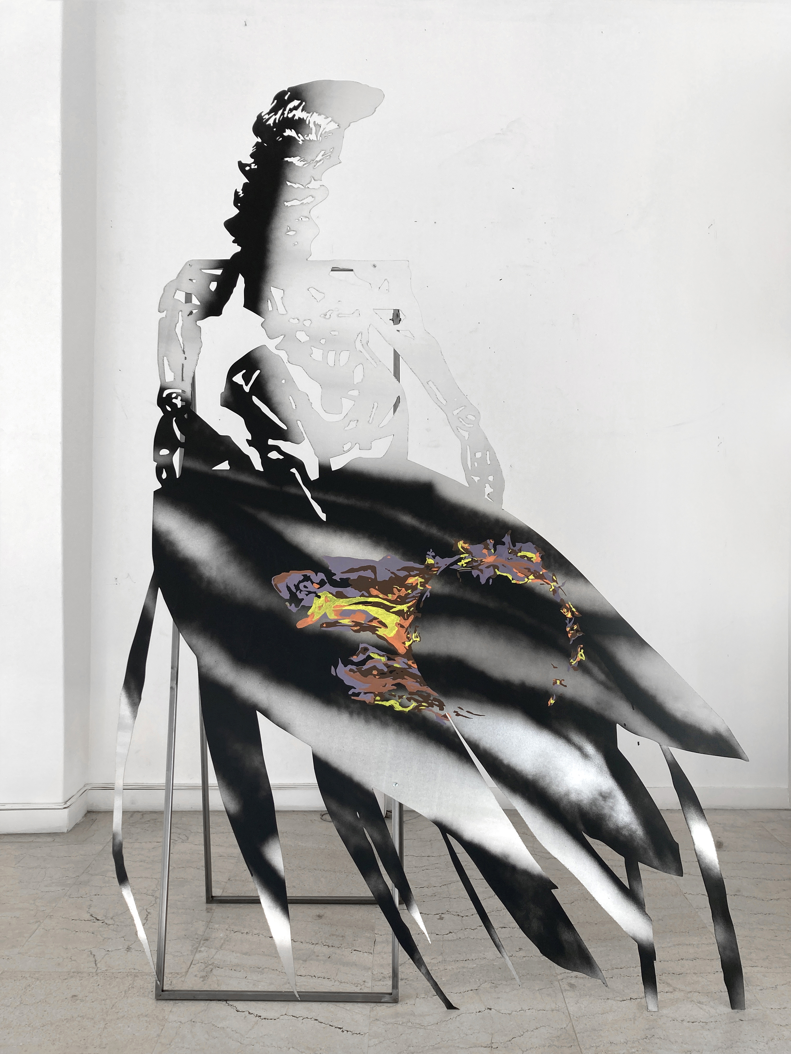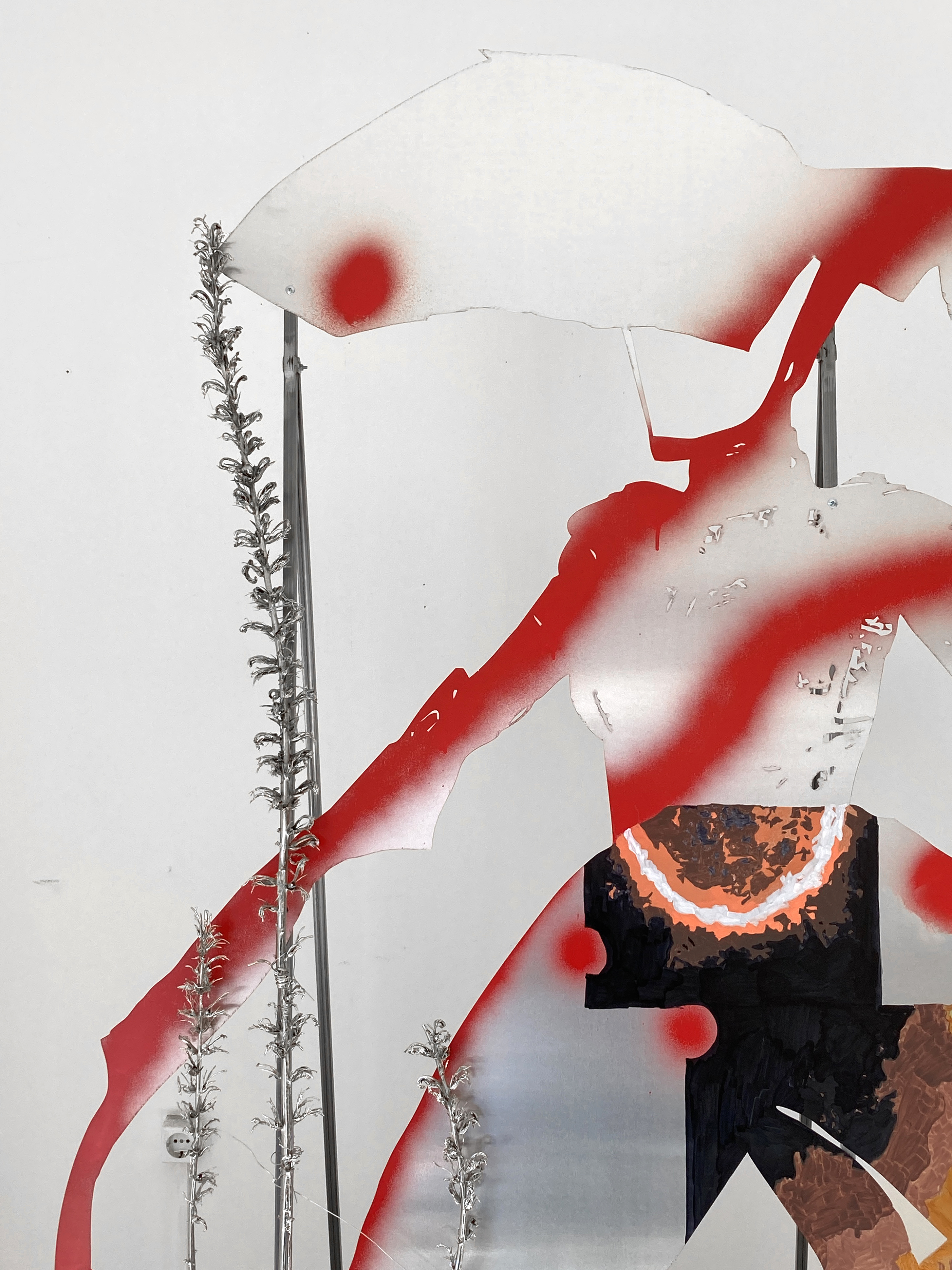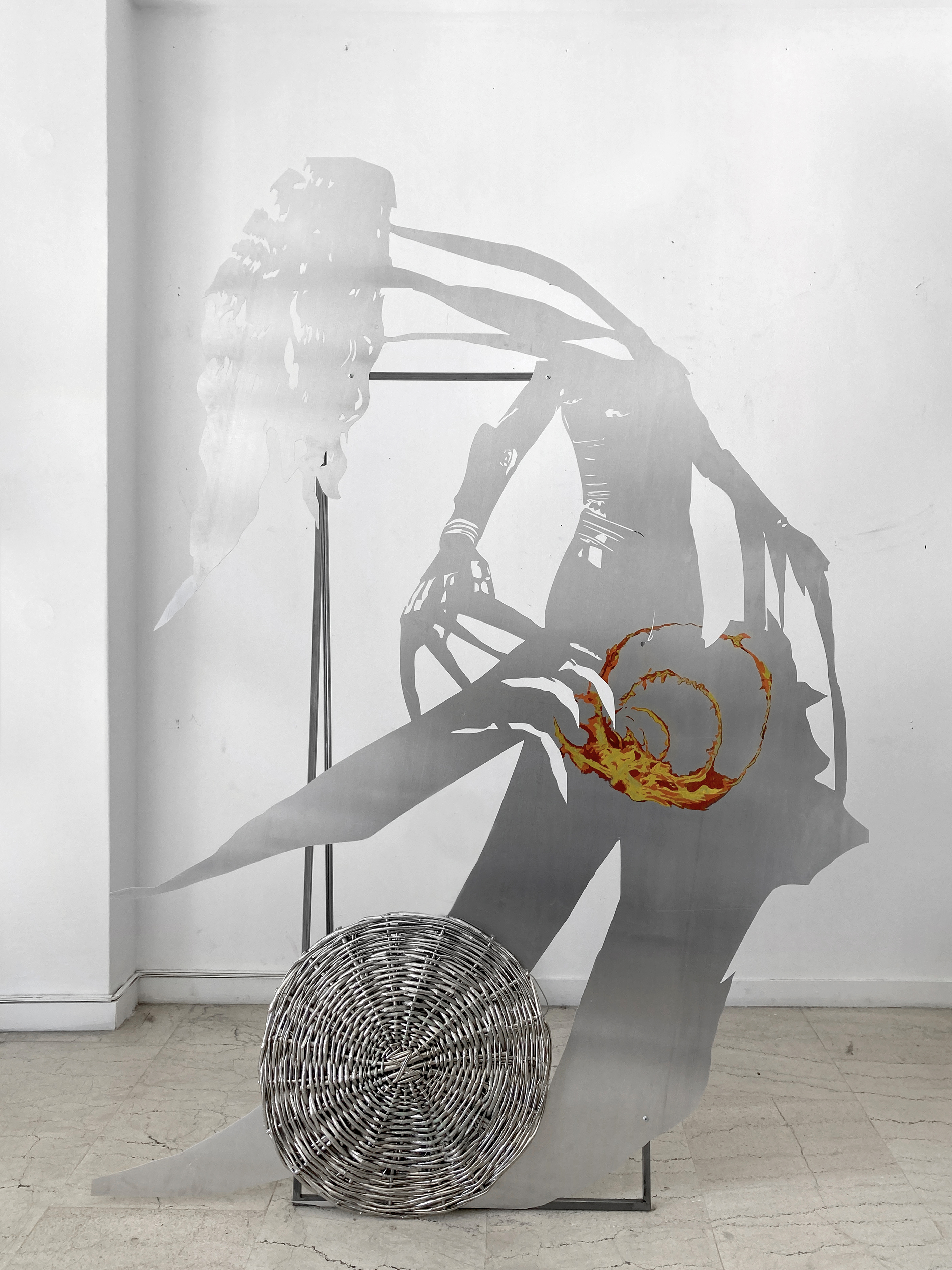 The installation Body X-XV consists of aluminum hybrid figures that resemble correspondents and solemn wanders at the same time. Continuing her series of works “Bodies”, the artist develops a cluster of two dimensional sculptures related to the warming climate of the Mediterranean. Structured from an assembly of human, technological and natural parts, the figures emerge as environmental beings. Although they cannot be identified with known characters or myths, the drawings and imagery on their epidermis reveal their geographic origins. The element of fire traced on the bodies implies that they have departed from turbulent locations, holding memories of wildfire incidents or being capable of healing affected places and traumas. These anthropomorphic but also eerie bodies are accompanied by elements that the artist collected at mediterranean regions; elements like thorns and baskets bear a physical remembrance of loss and ecological destruction but also a reality that is to be opposed by bodies captured in movement.*Commissioned and produced by Onassis Stegi