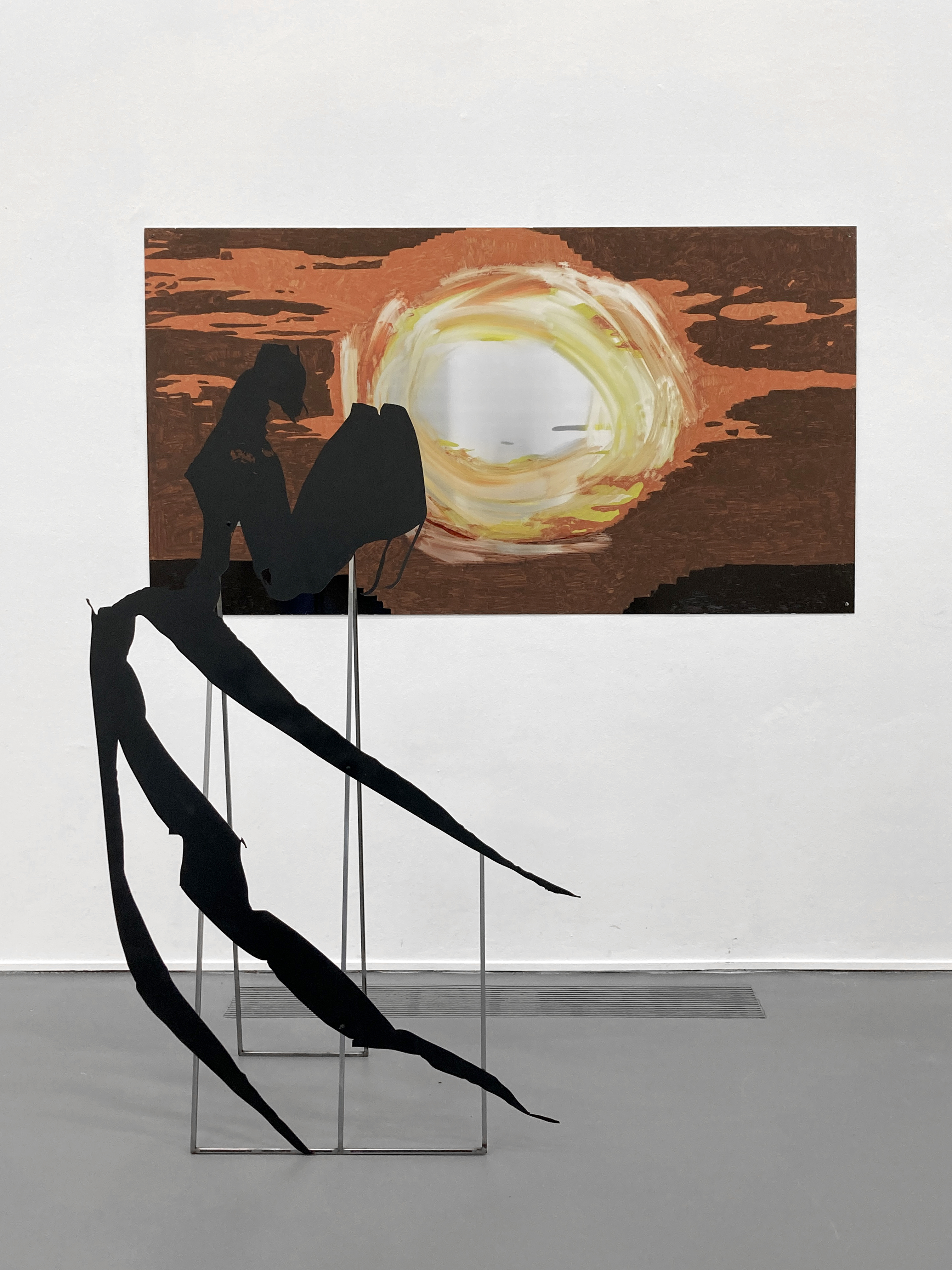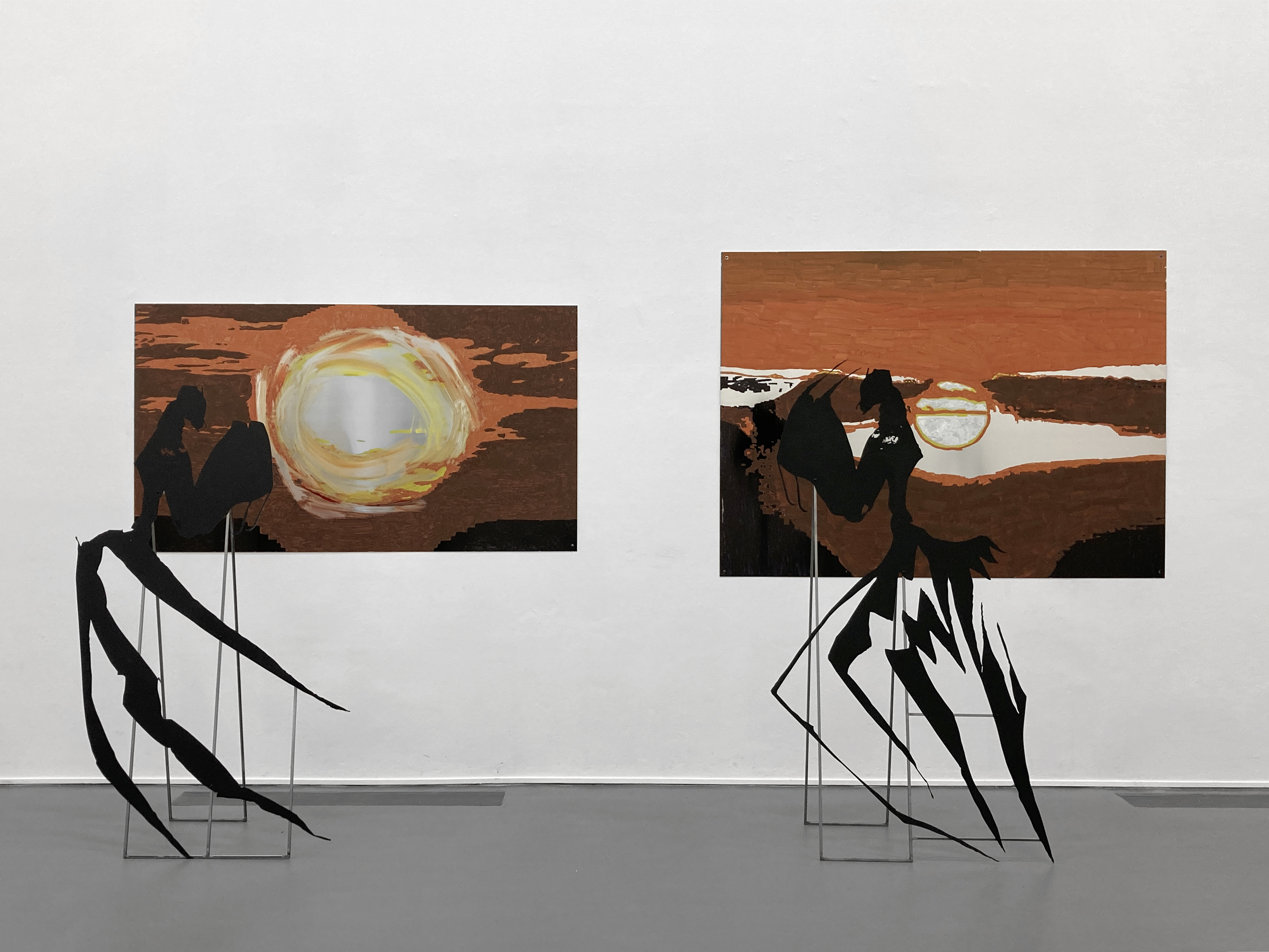 Dance Beyond IndividuationA plague passes through the skin, undoes the normal function of our organs. The body is in disarray. Perhaps we will recover and it seems things will go back to normal. Without worry over whether our organs are functioning, the boundaries of the body become re-secured. Or do they?We are taught from a young age to be intimately aware of the boundaries where our bodies end and other bodies begin. Encased in skin, we experience our bodies as a bundle of sensations that our mind and social common sense help us organize into body image and spatial awareness. But there are also those moments where the sense of the body and the sense of the self expand. Perhaps it’s a moment of intense empathy; we feel as if we can experience the sensations of another. Other times it could be the feeling that there is a nervous system or deeper sense of belonging that eludes our immediate comprehension. Despite how much we find ourselves staring at our own body and the bodies of others, so much of embodied experience exceeds the images we can make.Philosophers Giles Deleuze and Felix Guattari offer the existence of a “Body without Organs” to begin undoing the sense that bodies can be contained by the image forms we associate them with. For Deleuze and Guattari “A Body without Organs is made in such a way that it can be occupied, populated only by intensities. Only intensities pass and circulate.” Following Deleuze and Guattari, we wonder, what if a body need not be understood only as a scientific organism? What if the individuated human body is just one of the many guises that sentience appears through?I gaze at myself in the mirror and in my sway I see the shift of a mantis. I lie down and feel my body float–my bed is not my bed. The contact my skin makes with the sheets creates small intensities of sensation and enfold me into the materiality of cotton. Research into mycellium and posthuman animacies point us to more-than-human configurations where the horizon of a body’s unknown composition in culture, science, and cosmology unfold into new manifestations of awareness. The world transfers its impressions onto us constantly. We can only feel so much by ourselves.Julia Kristeva argues that “at the crossroads of body and meaning, of biology and sublimation it is perhaps dance more than other trans-linguistic experiences that informs and accompanies the process of transhumanization as it counters the crisis and exceeds the impending threat of apocalypse”. Dance is a way to move with others, to find more ways to create meaning and methods of relating signs with new constellations of significance.The fold of “others” need not remain with the terrain of human persons however. Our bodies coexist in complex ecosystems. We are affected by and affected by the environment. Our bodily materiality includes “nonhuman bodies, organic or inorganic.” For those marked within biopolitics’ animacy hierarchies that distribute chances towards life and death along lines of ability, race, class, and gender, some persons and entities are considered objects first, sentience second.Sculptures are choreographed, rhythm motivates animal-human-machinic imaginaries . Mantises molt their exoskeletons and we are dancing with words and matter trying to molt well-formed ideas. A dance between sentience, subjectivity and objectivity; AI dreams, body fluids, oil paint and transcorporeality. Lito’s Mantises reclaim multiple time zones and redress multiple (gendered) history injustices. A sun setting and a sun rising, hot plasma on an aluminium plate. Dancing Plague reclaims the museum as a dancing space–a club where animacy hierarchies loosen their hold. Kinesis runs through our normal distinctions allowing identities to become fluid and things to be symbiotic. In such space, the body becomes more than one, boundaries soften. In this porous and diffuse state what sorts of social bodies emerge that might exceed the scale of impending threats towards life?For the installation Myriad Worlds as Ours, three bodies of Mantises are situated in dialogue with a sunrise and a sunset, part of a series of paintings where the artist examines the circularity of time and its flow through the relationship of human and other-than-human agents with the environment and the astral phenomena of the Sun. The bodies of Mantises have been considered to have supernatural powers in many early civilisations not only for their praying posture but for being perceived as well as a trickster deity, a companion showing travellers the way home, an escort of the soul of the dead to the underworld, a necromancer, a soothsayer. The female mantis has been imagined as a femme fatale, a powerful predator and a symbol of female authority signified through sexual cannibalism applied in about a quarter of male-female sexual encounters of the species. Their body moves in repetitive swaying side-to-side movements as if resembling the vegetation in the wind, a mechanism also allowing them depth of field.Panos Giannikopoulos and Dahlia Li*Excerpt from the catalogue of the exhibition