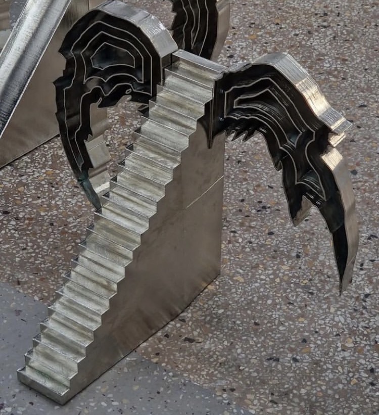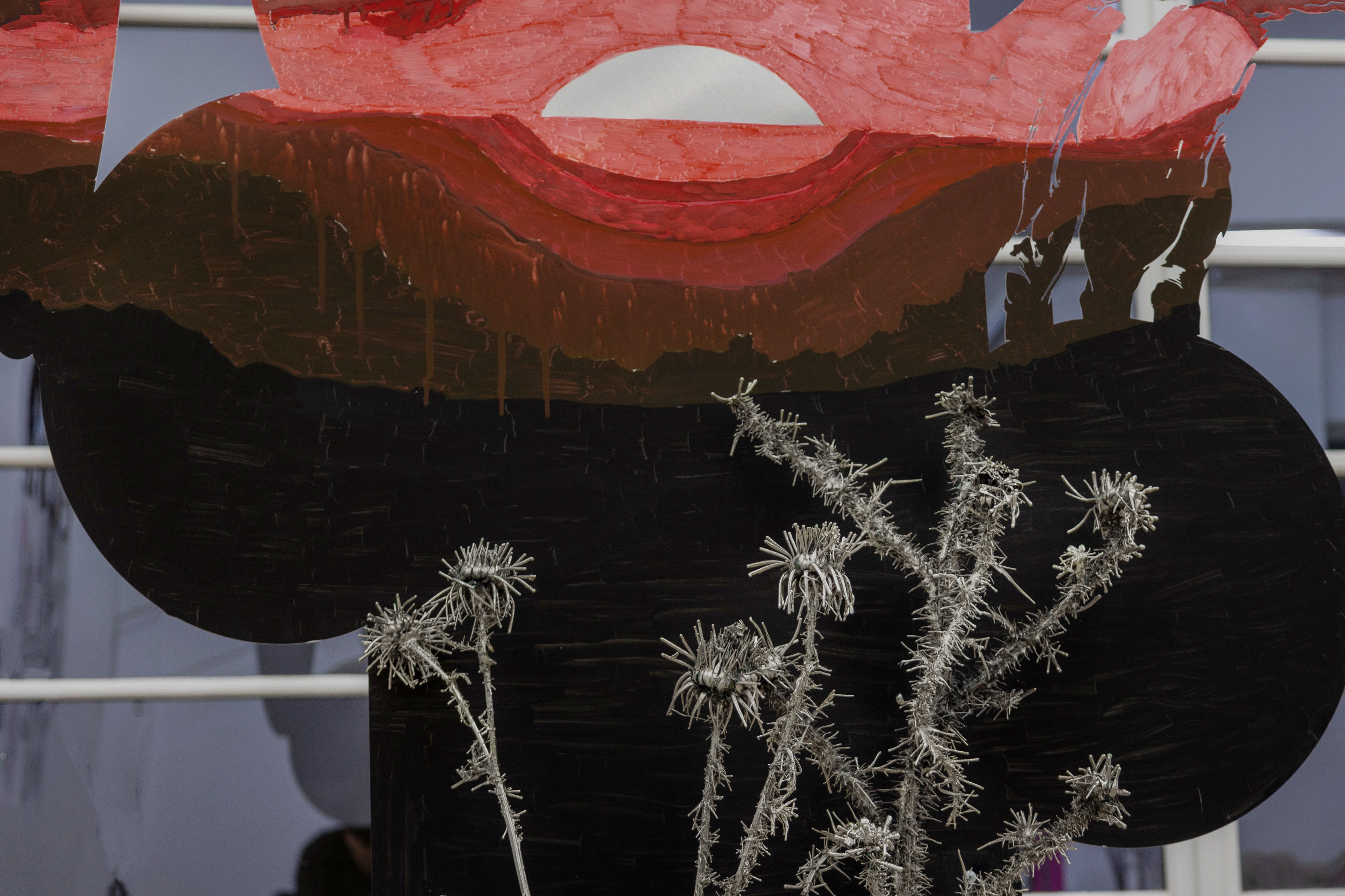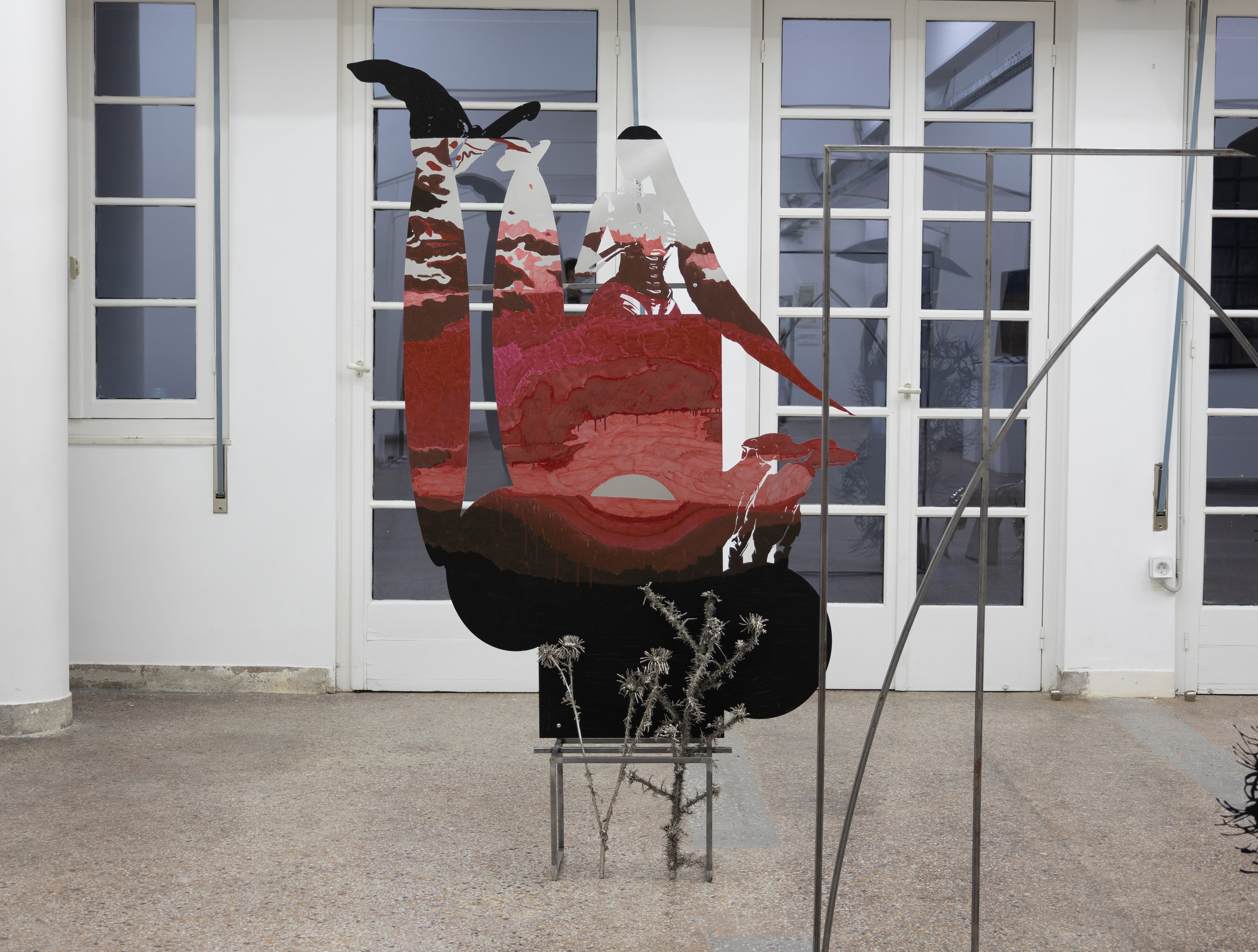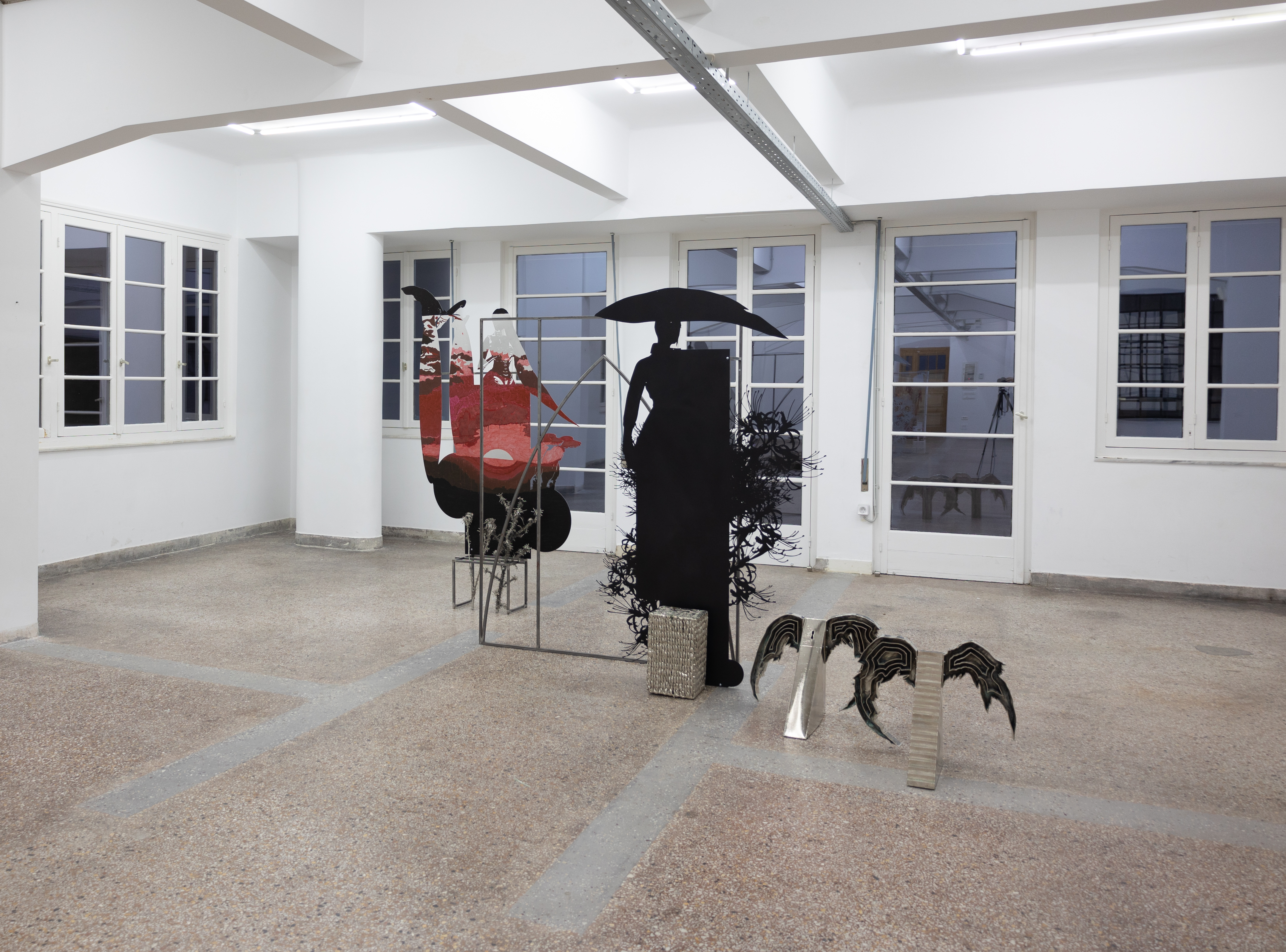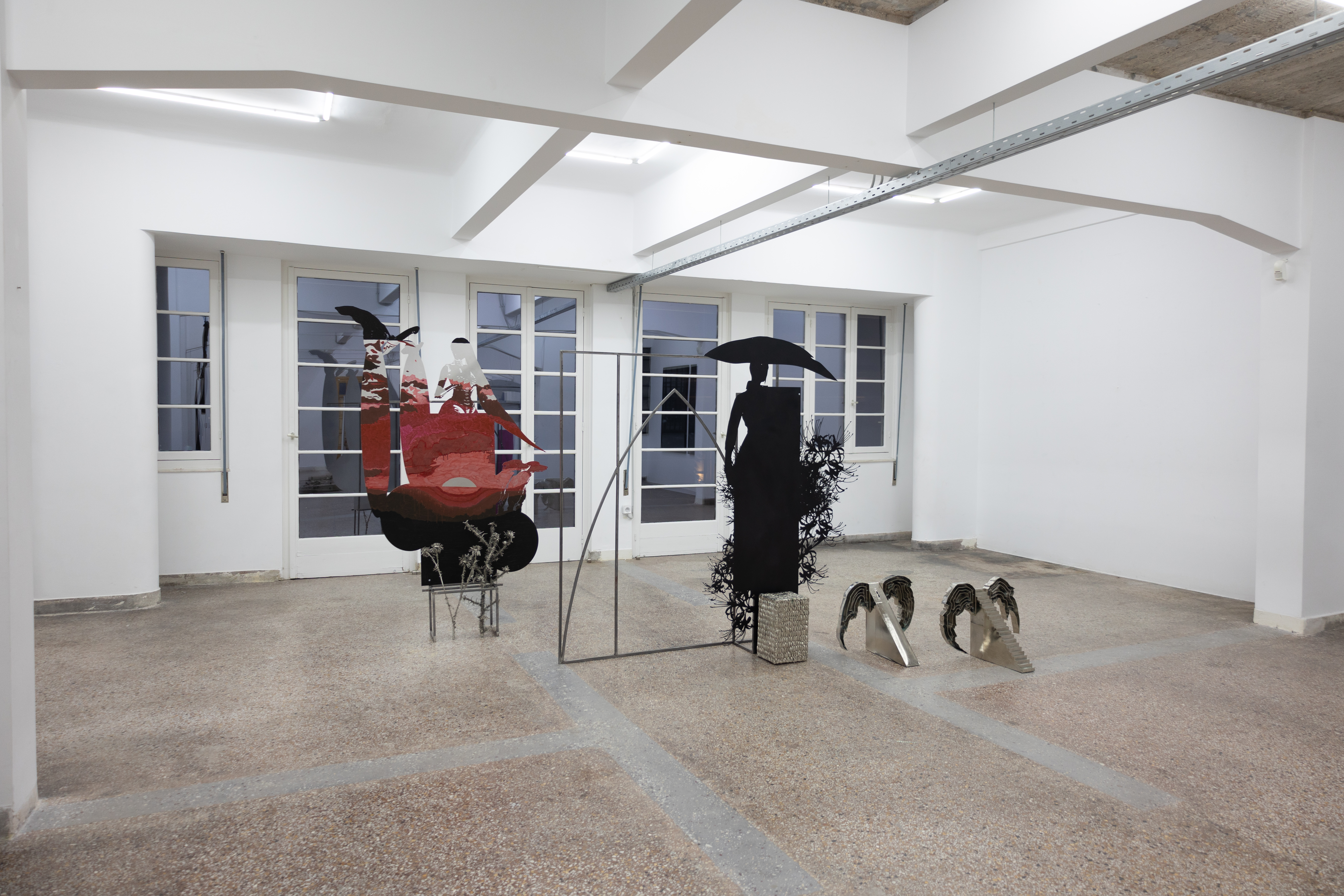 The works Sunset Gatherer (2023), Harvester I (2022) and Wingslocks (2024) come together in an installation under the title ‘Night Hour’ where they construct a mesh of fluid space-time. Shadow bodies perceived in the frontal plane and perpetual walkers carry with them relics of a nature they seek or may have lost. Thorny flowers - which the artist collects and transforms from organic to inorganic matter - are attuned to their bodies as imprints or carried along with companion animals in their wanderings.These weightless presences, whose volume is greatly reduced under the red hot sun - present in their constant dislocation, are perhaps manifestations of the same person in different conditions of their wanderings. Sunset Gatherer could be perceived for the context of the exhibition as a personification of Dido of Carthega, who thwarted by her love for Aeneas, suicides and wanders as a shadow in hell. She meets him there again in the Night when he descends to Hades to speak with his dead father. Relics or signs of architecture are both her personal shelters and the portals of her movement between worlds. Following Dido in her various guises, demons, angels, souls, or other disembodied manifestations of herself, unlock her arrival or departure in landscapes of her psyche or in territories of self-fulfilment.__photos: Lila Efremidou
