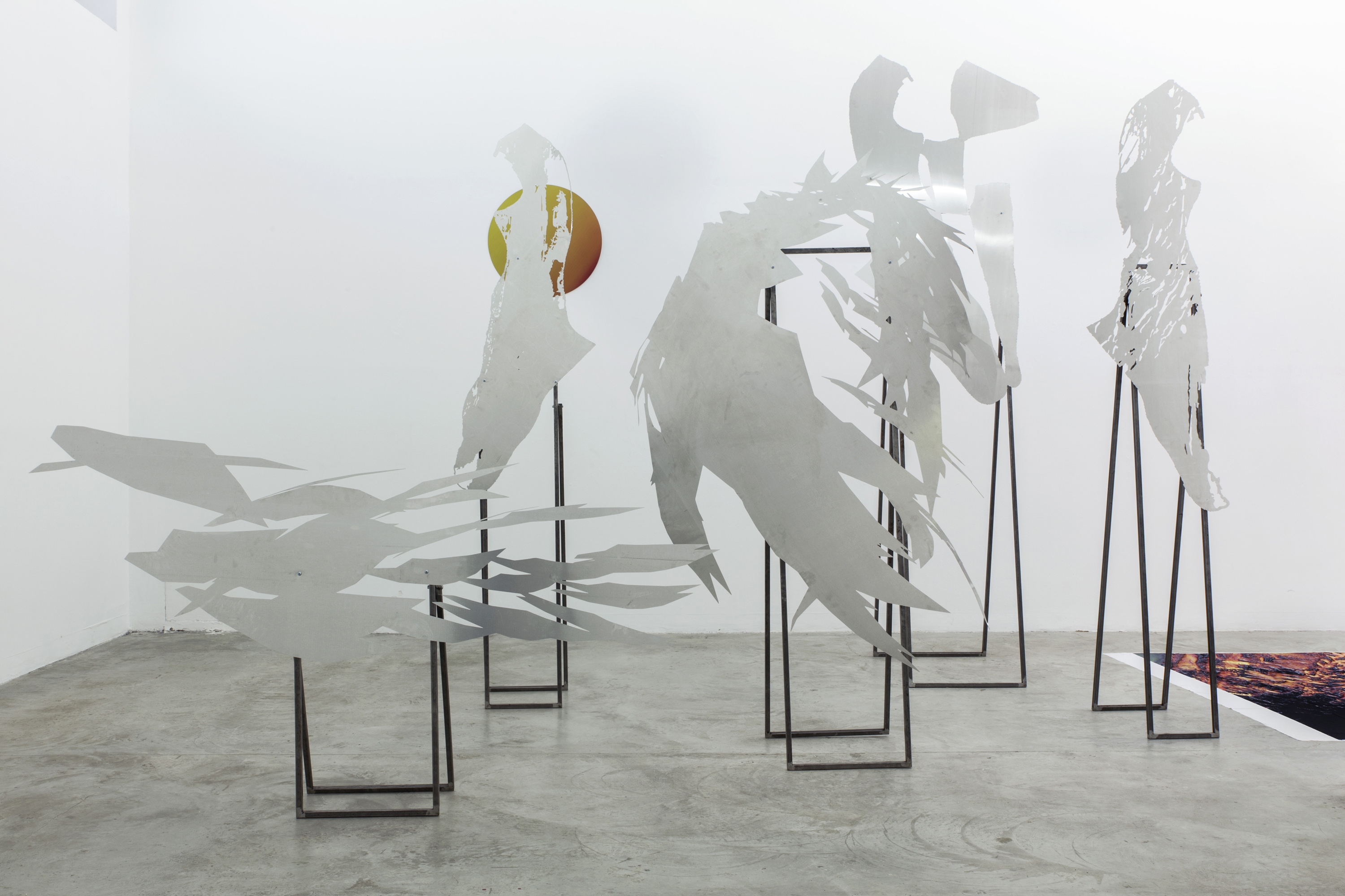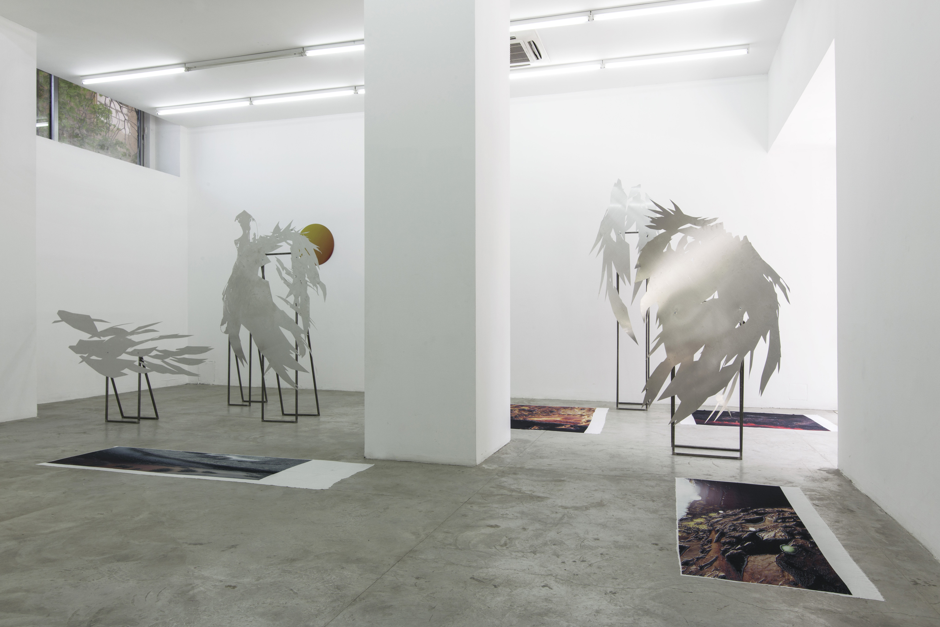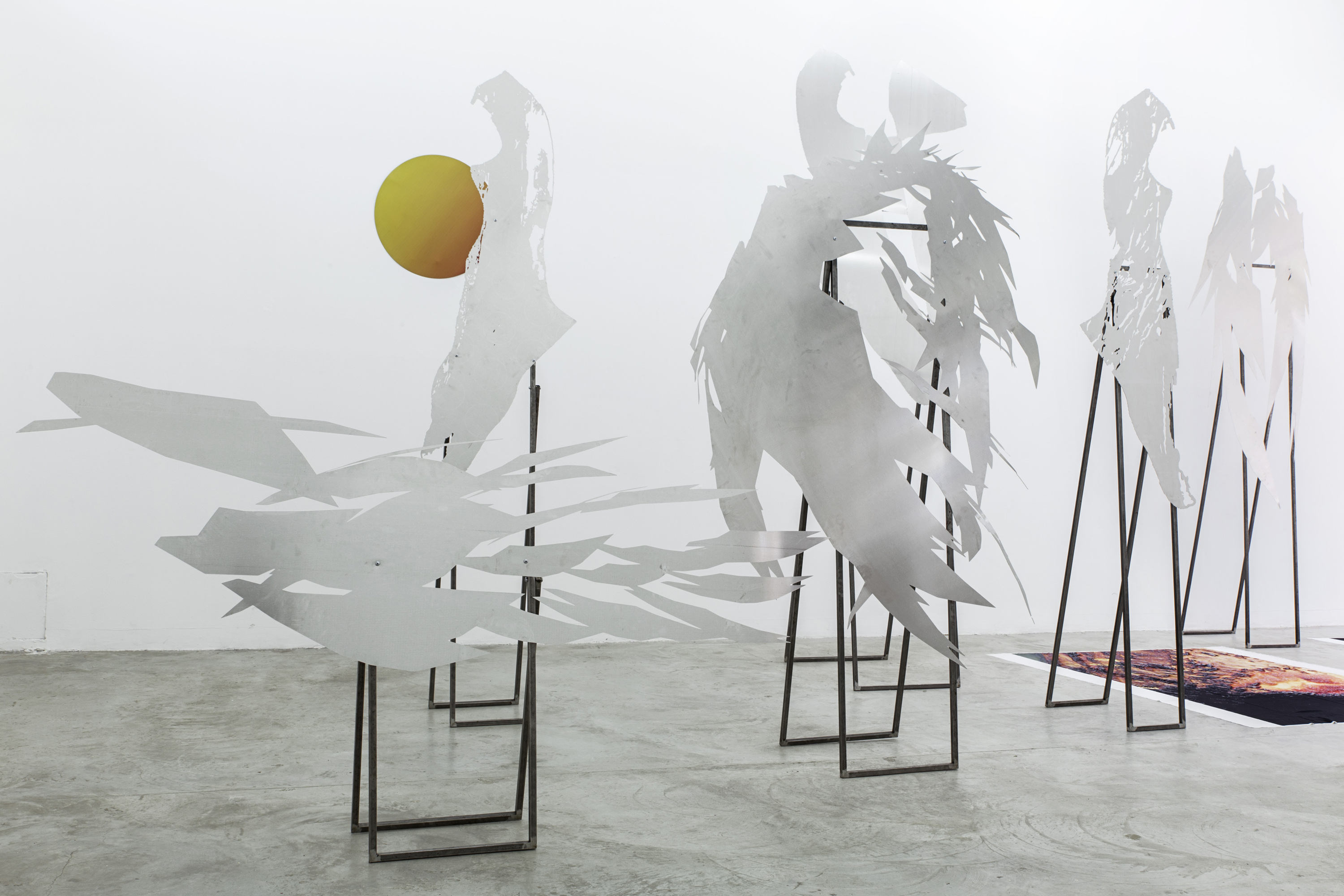 Lito Kattou, San, Point Centre for Contemporary Art 2018, Installation view. Skins & Feathers I; II, 2018; Sun, 2018; Skins & Feathers III; IV; V; X, 2018. Photo: Nikos Alexopoulos
