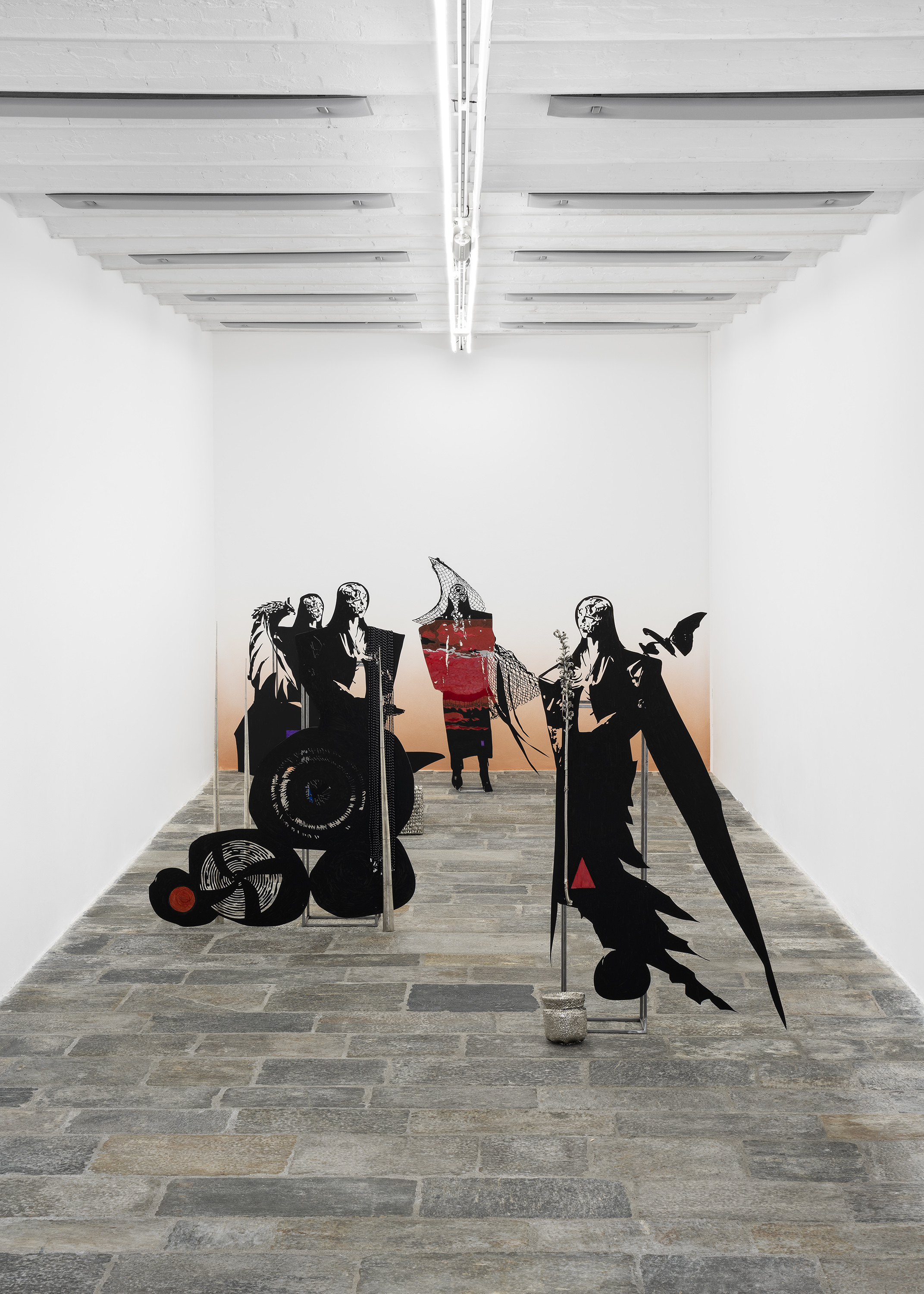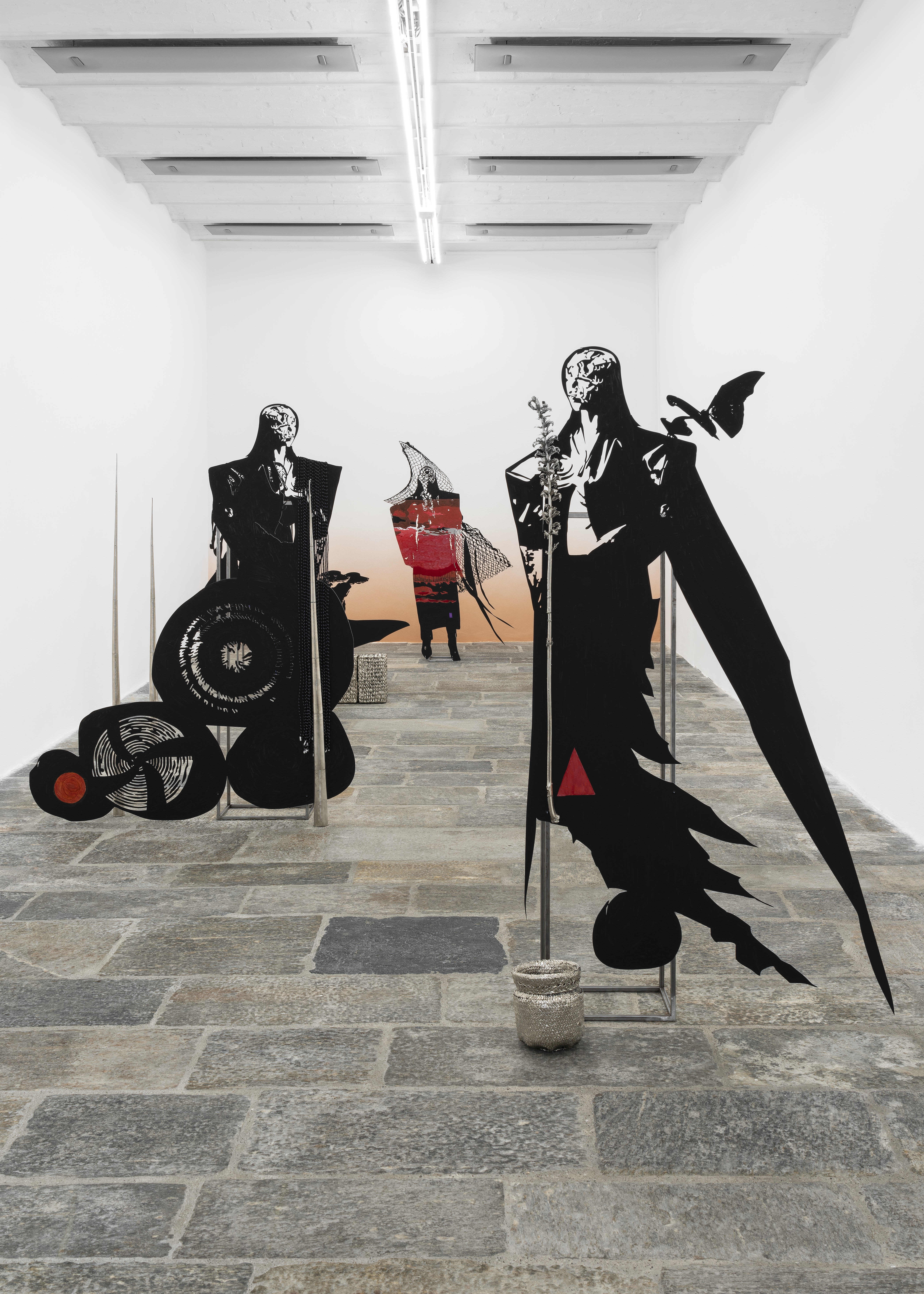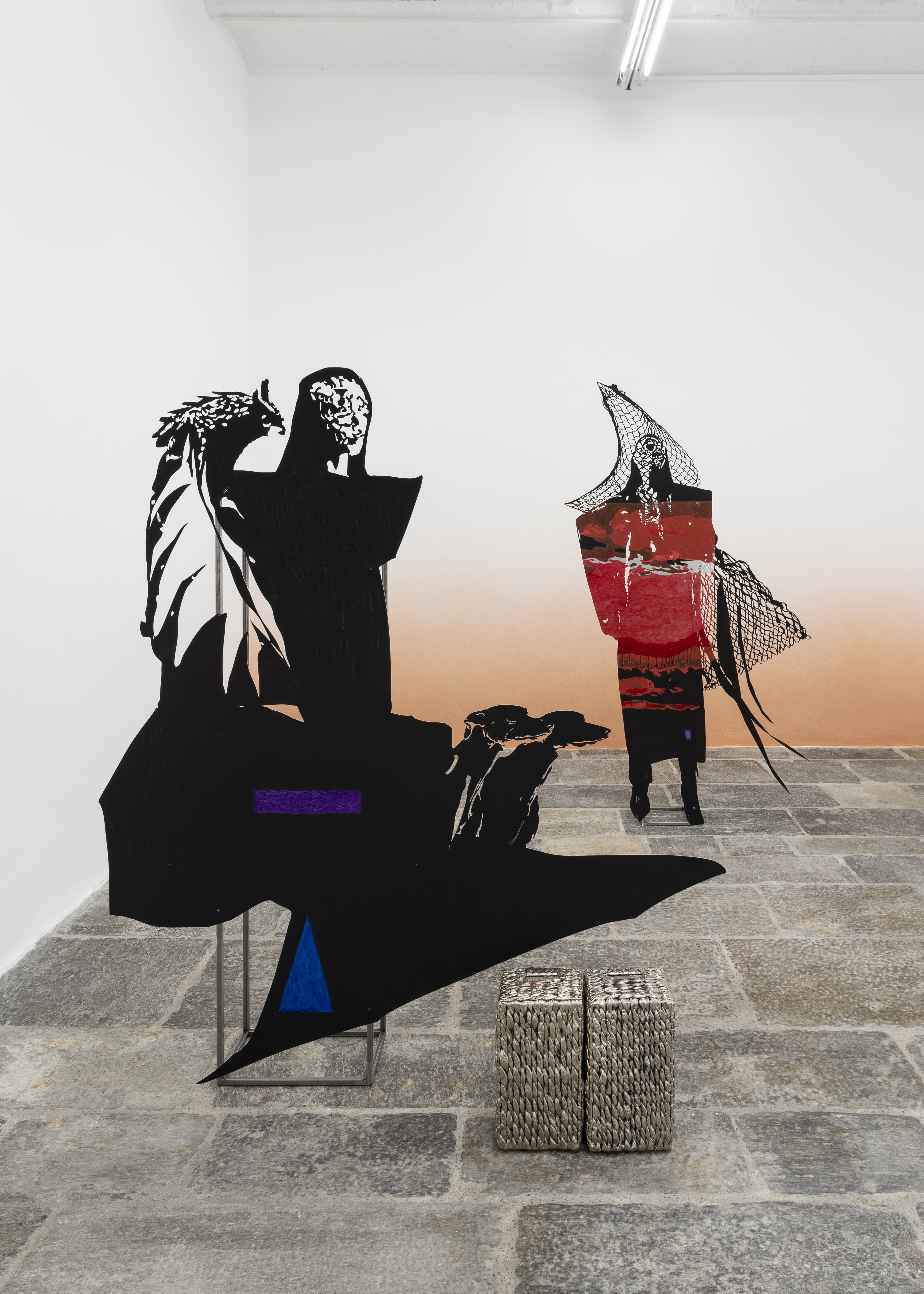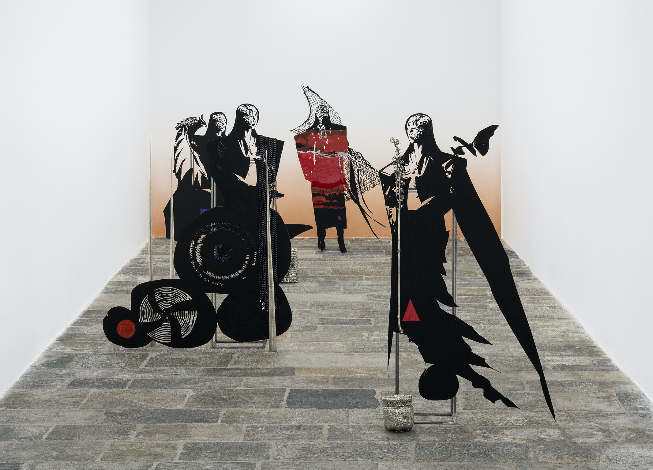 Whisperers is the first solo exhibition in an Italian institution by Lito Kattou, whose research is influenced by the natural, social and political context of the Mediterranean region. Inspired by local mythologies, stories and archaeologies, into her practice the artist has inserted themes such as the reconciliation between life and death and acceptance of the linearity and circularity of time, through which she reflects on the coexistence of different realities. Her works – bodies, hybrid and abstract creatures, anthropomorphic or animal, incorporated within which are natural and cosmic elements - analyses the process of changing matter in time, the theme of otherness and unknown space-time scenarios. The series Whisperers from 2022, like the previous Harvesters focuses on the idea of community in a timeless setting that identifies new strategies of coexistence. For the spaces of the Fondazione Pomodoro the artist has created Whisperer I, II, III and IV, four imposing sculptures made of aluminium, steel, acrylic, nickel-plated copper and biodegradable plastic, representing four components of a community – linked together by symbols, signs and fragments composing a familiar grammar – connected to Whisperer V, a fifth sculpture mounted on the façade of the Fondazione ICA Milano, an intervention acting as a bridge between the two institutions, thus solemnly establishing the collaboration. In the sculptures, Kattou assimilates human and non-human elements, figures deriving from nature and the animal world, in an attempt to imagine a new form of existence constantly adapting and transforming with the surrounding environmental forces. All endowed with the same face, in a frozen landscape at sunset, the black surfaces of the bodies, arranged so as to mark out the space structuring the route for the public, are interrupted by painted parts that highlight some of their gestures, accompanied by figures of animals, flowers and butterflies, woven baskets recalling not only the artist’s origins, but also the Cypriot colonial period. The basket is the cue for a broader reflection on the cultural evolution of humanity: as writer Ursula K. Le Guin states in The Carrier Bag Theory of Fiction (1986), “the first cultural device was probably a recipient ...and that the earliest cultural inventions must have been a container to hold gathered products”. A vision that disempowers the object-weapon as the main element of evolution and instead tells a story of support and collaboration, of intelligence and common practice used to the benefit of the community. Whisperers represents a space where it is possible to accept coexistence with different entities and to imagine alternative approaches and methods for living together, within a perspective that places the community at the centre and increases the awareness of the needs of other species and for the safeguarding of the planet. Chiara Nuzziphotos: Tiziano Ercoli | Andrea Rossetti