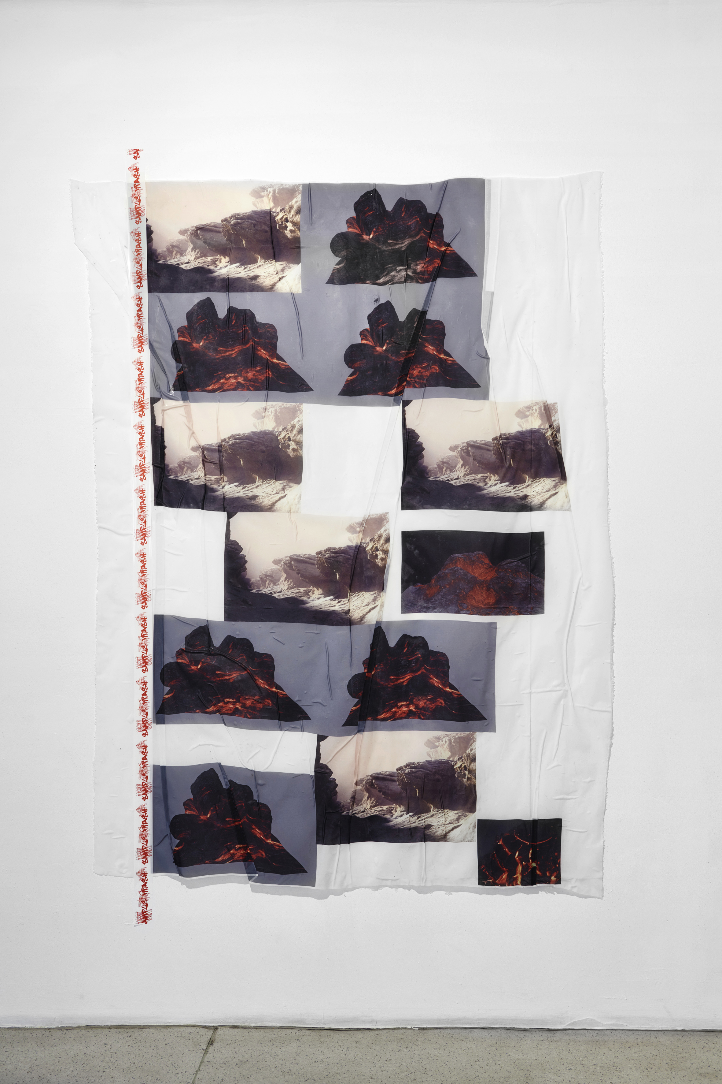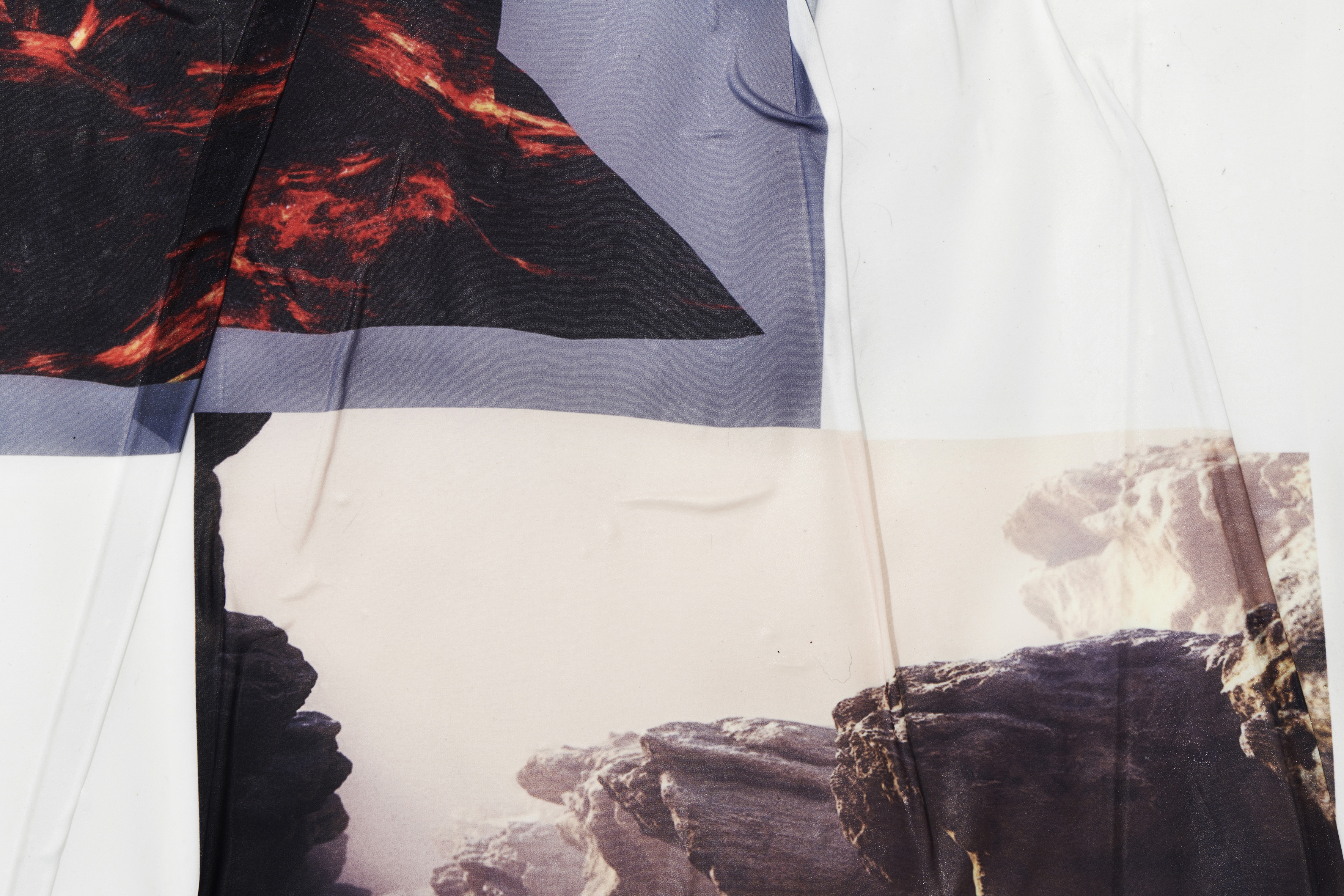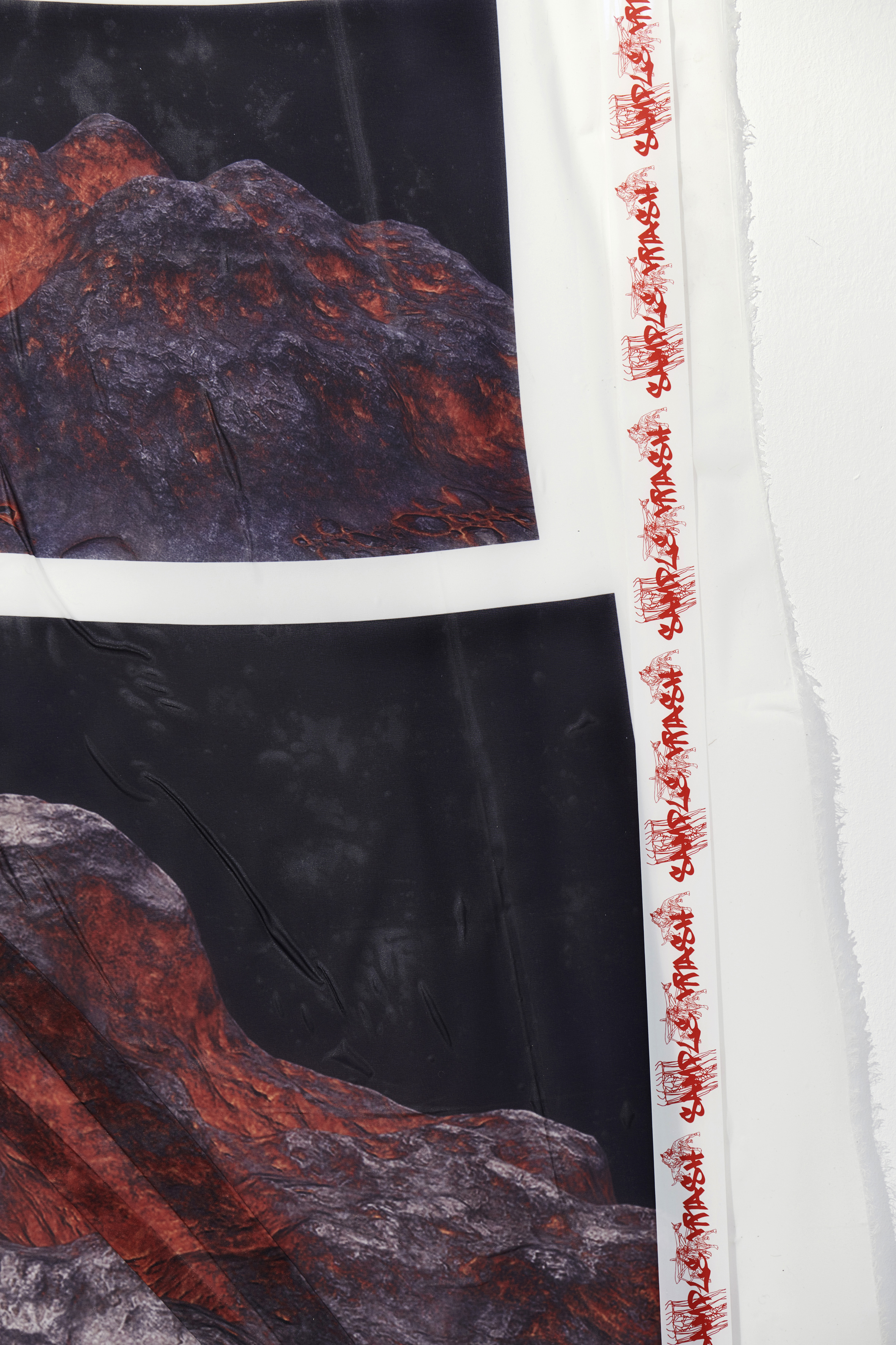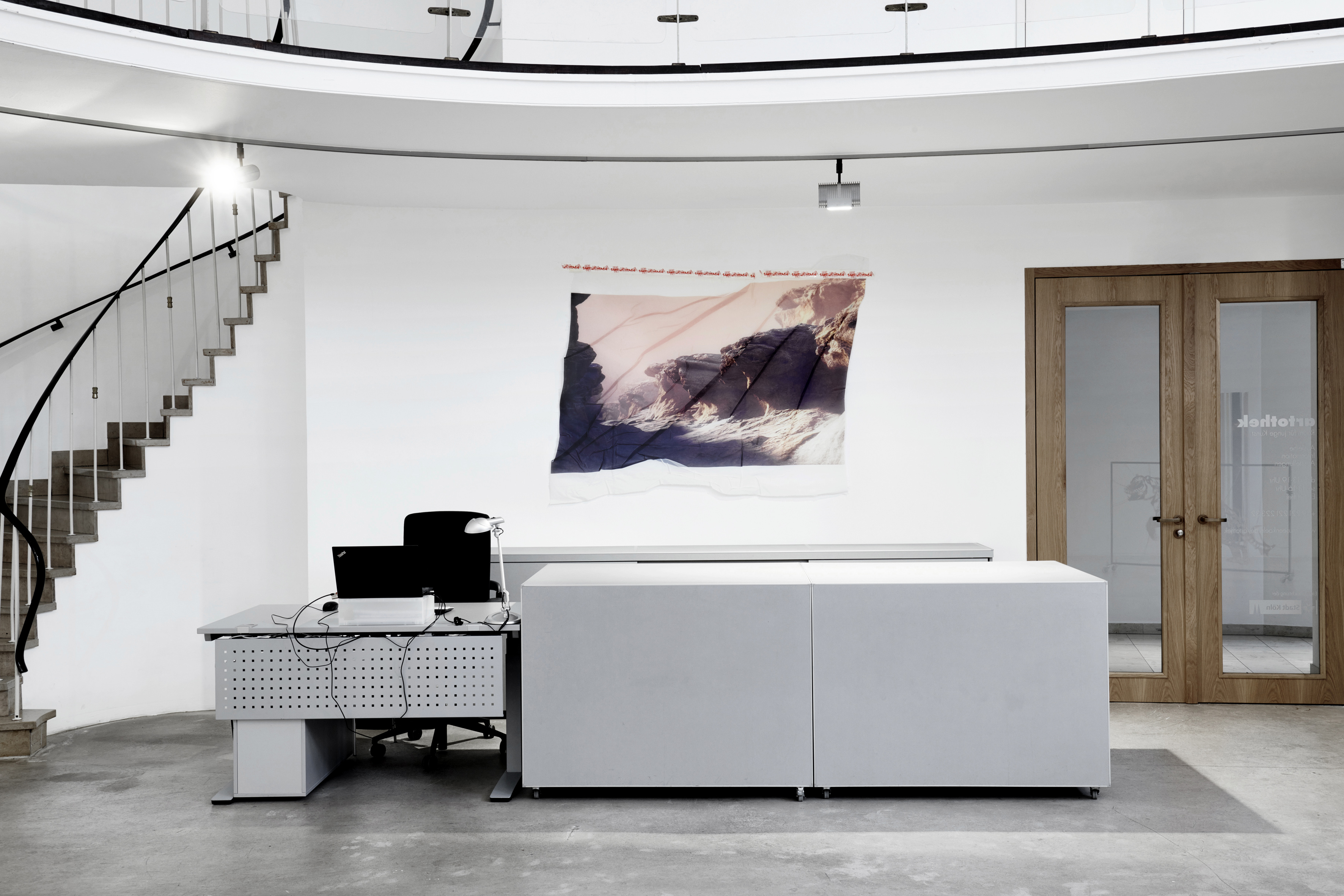 Empty AfternoonsArthotek, CologneMar 13 - Apr 12, 2019Bodies are now absent. Beings in constant redefining have abandoned their weaponry. The surrounding landscapes have probably absorbed their bodies… All these paths and roads they have taken and walked… And then, all of a sudden, the majestically standing mountains, volcanoes and rocks have incorporated those fighters in their multi-layered structures. An absolute captivation, where organic matter flows back in inorganic matter and what is “technology” is spitted out at the top layer. Now, in solitude, those new body-personified landscapes are more present than ever and so they will pursue continuity in deep-time existence. Still geological forms and bodies/monuments in transcendence, boiling, frustrated voices of matter. Frozen? Is it Gaia in a slightly aggressive or extroverted mood? They are standing there waiting for the next reaction, the next millimetres of transformation in their own understanding of volume and time."Empty Afternoons" brings together a new series of works by Lito Kattou, continuing the development and research of her interests in posthumanism, ecological concerns, non-patriarchal understanding of matter, moments of transformation, the absence and presence of the body, modes of roaming and intimate communication and flatness as a an articulation of volume. The symbolic power of what a mountain/volcano and a bow could be is revealed and unfolds through the personification of the landscape. All wall pieces are digital incarnations of rocky geological terrains captured in various angles, taken from 3D models through simple screenshots and then saved on her desktop. The images are digitally printed on synthetic textiles. The lightness and transformability of the textile as a material solidifies by a chemical component. The terrains are captured in a moment of unfolding or stretching out and in this way petrified textile, flat wall sculptures are created.