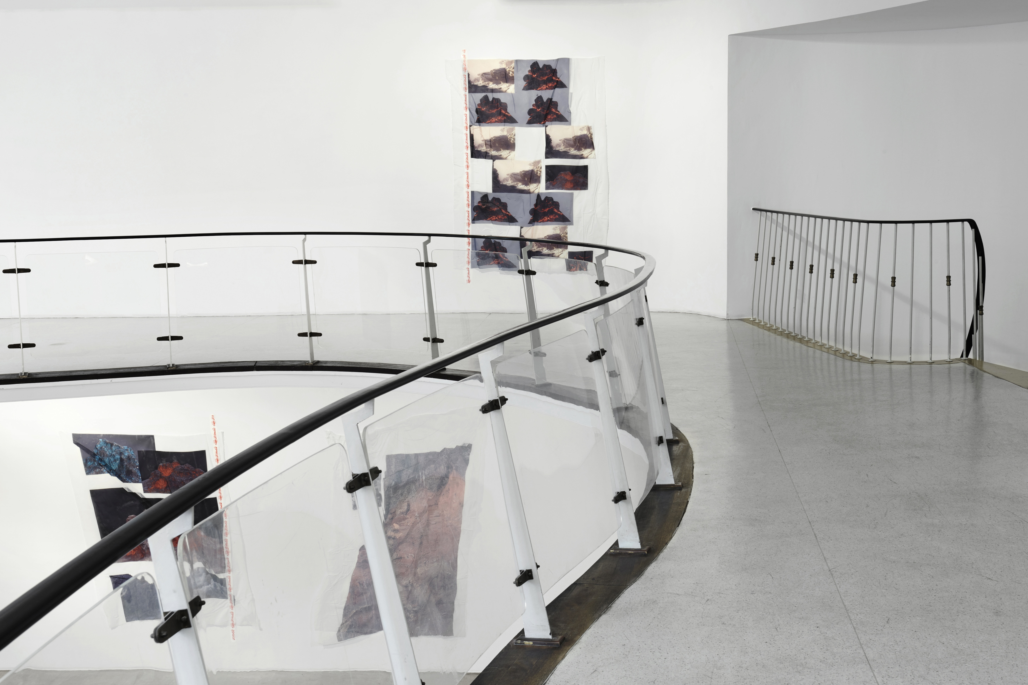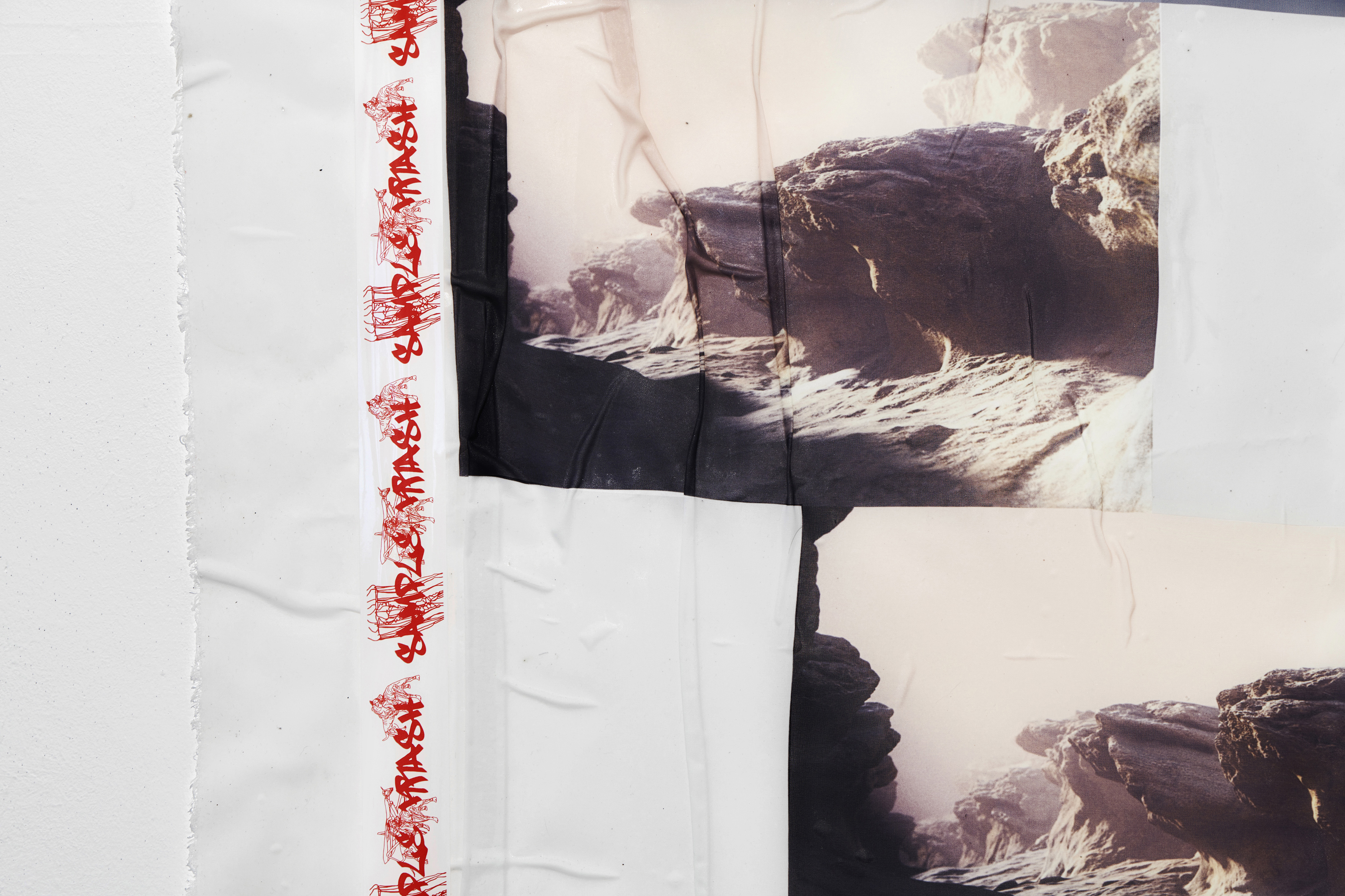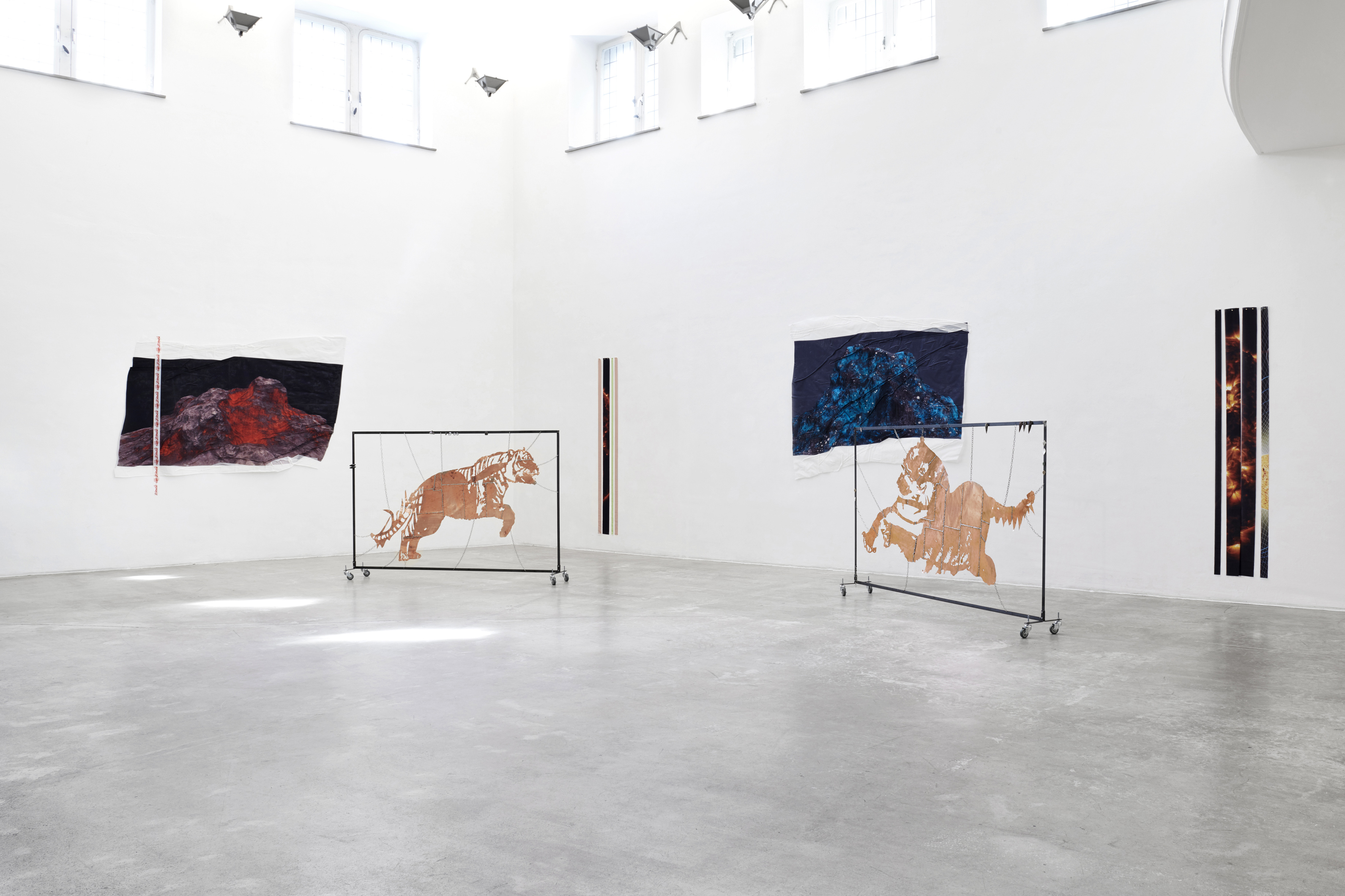 Empty AfternoonsArthotek, CologneMar 13 - Apr 12, 2019Bodies are now absent. Beings in constant redefining have abandoned their weaponry. The surrounding landscapes have probably absorbed their bodies… All these paths and roads they have taken and walked… And then, all of a sudden, the majestically standing mountains, volcanoes and rocks have incorporated those fighters in their multi-layered structures. An absolute captivation, where organic matter flows back in inorganic matter and what is “technology” is spitted out at the top layer. Now, in solitude, those new body-personified landscapes are more present than ever and so they will pursue continuity in deep-time existence. Still geological forms and bodies/monuments in transcendence, boiling, frustrated voices of matter. Frozen? Is it Gaia in a slightly aggressive or extroverted mood? They are standing there waiting for the next reaction, the next millimetres of transformation in their own understanding of volume and time."Empty Afternoons" brings together a new series of works by Lito Kattou, continuing the development and research of her interests in posthumanism, ecological concerns, non-patriarchal understanding of matter, moments of transformation, the absence and presence of the body, modes of roaming and intimate communication and flatness as a an articulation of volume. The symbolic power of what a mountain/volcano and a bow could be is revealed and unfolds through the personification of the landscape. All wall pieces are digital incarnations of rocky geological terrains captured in various angles, taken from 3D models through simple screenshots and then saved on her desktop. The images are digitally printed on synthetic textiles. The lightness and transformability of the textile as a material solidifies by a chemical component. The terrains are captured in a moment of unfolding or stretching out and in this way petrified textile, flat wall sculptures are created.