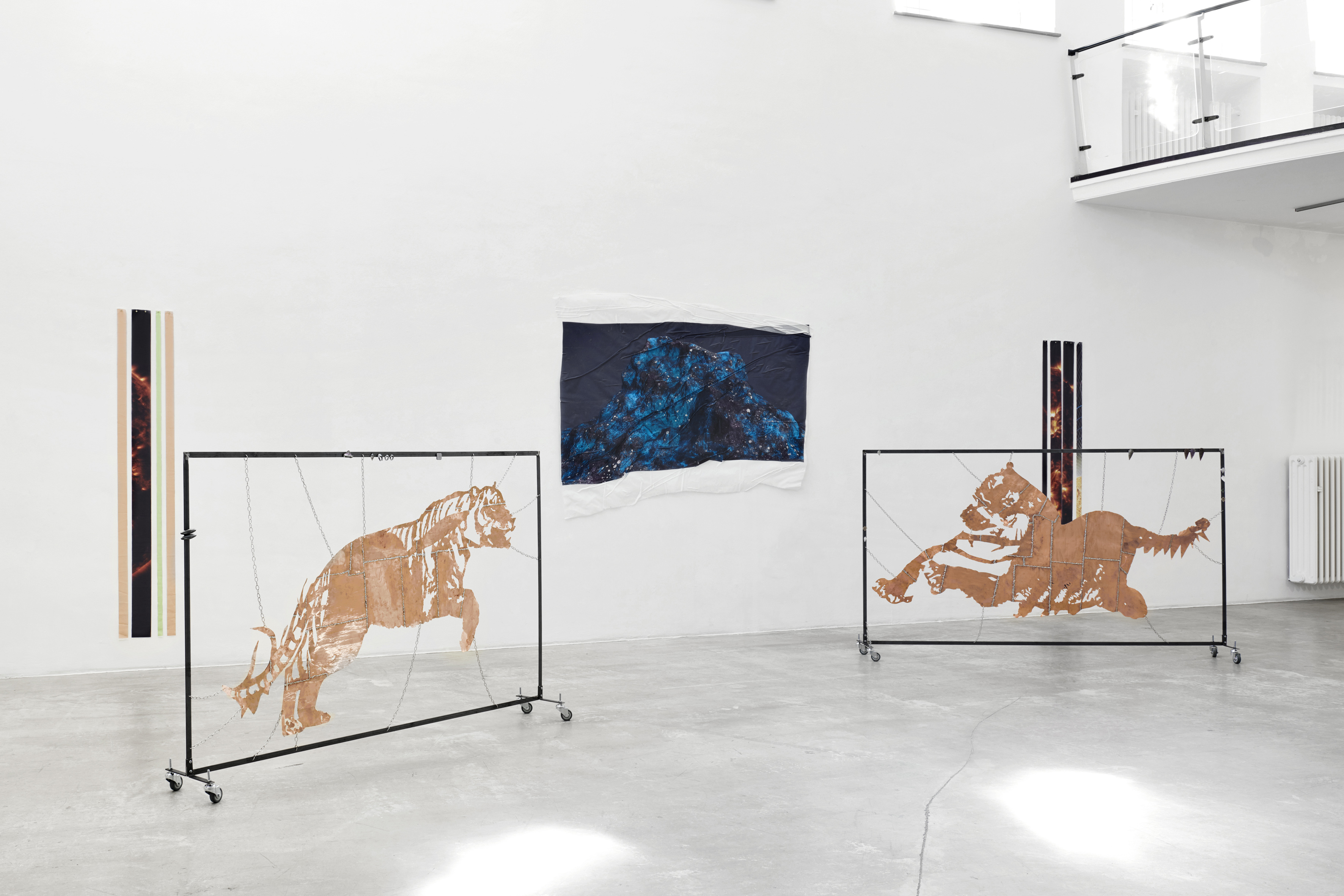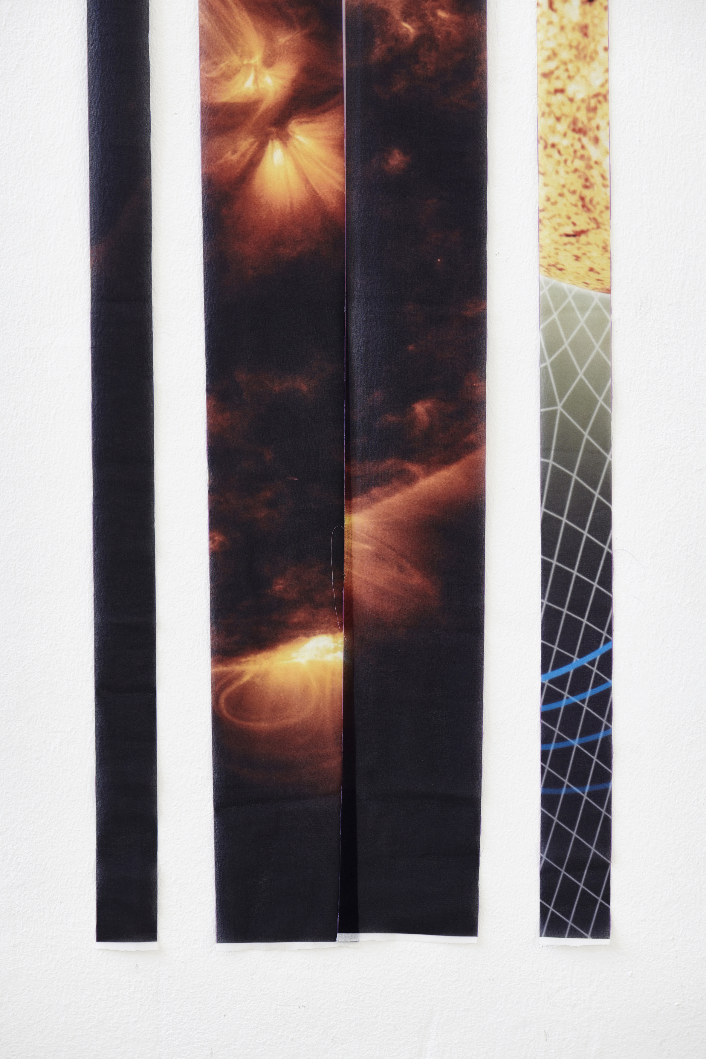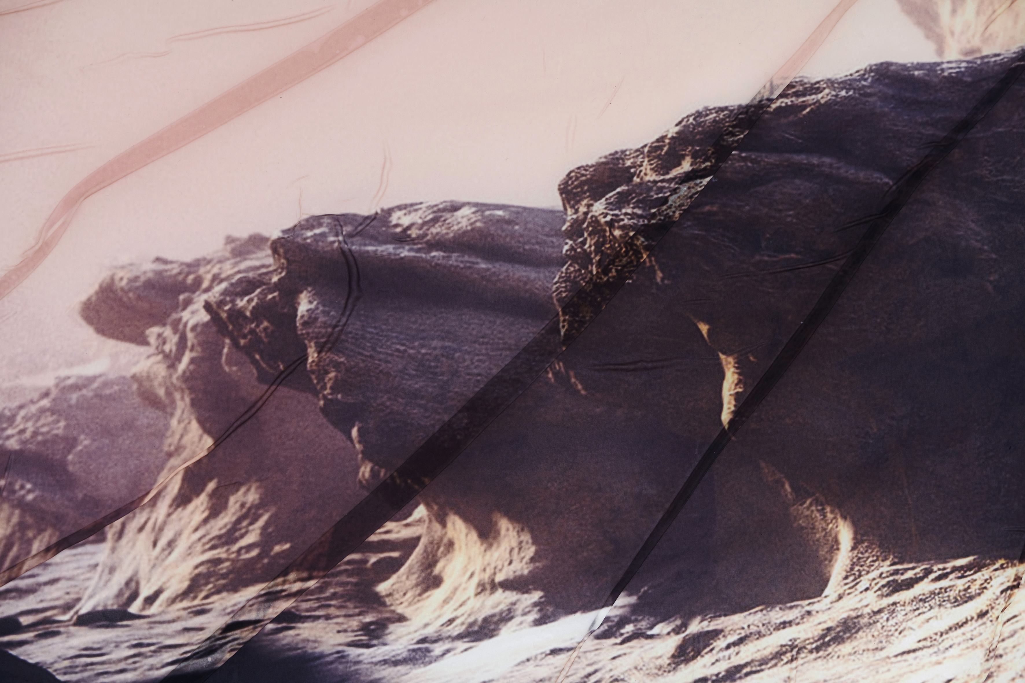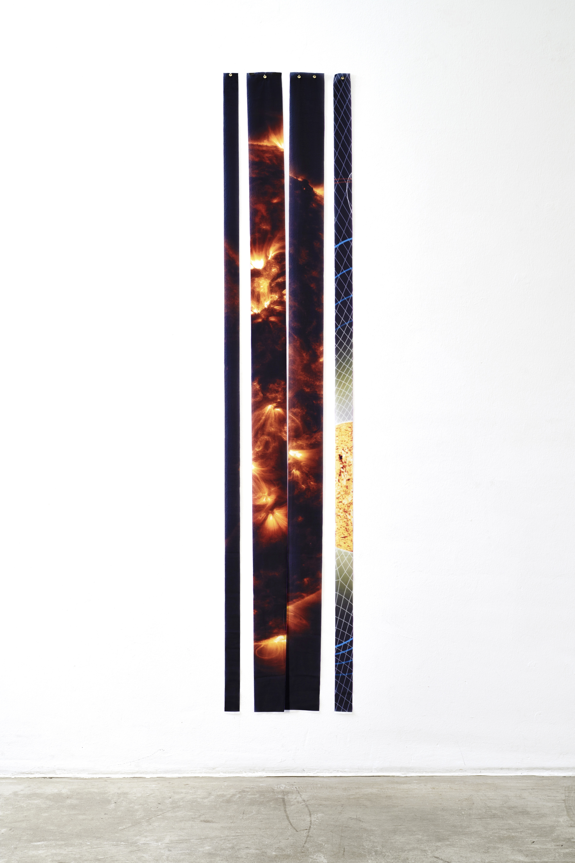 Empty AfternoonsArthotek, CologneMar 13 - Apr 12, 2019Bodies are now absent. Beings in constant redefining have abandoned their weaponry. The surrounding landscapes have probably absorbed their bodies… All these paths and roads they have taken and walked… And then, all of a sudden, the majestically standing mountains, volcanoes and rocks have incorporated those fighters in their multi-layered structures. An absolute captivation, where organic matter flows back in inorganic matter and what is “technology” is spitted out at the top layer. Now, in solitude, those new body-personified landscapes are more present than ever and so they will pursue continuity in deep-time existence. Still geological forms and bodies/monuments in transcendence, boiling, frustrated voices of matter. Frozen? Is it Gaia in a slightly aggressive or extroverted mood? They are standing there waiting for the next reaction, the next millimetres of transformation in their own understanding of volume and time."Empty Afternoons" brings together a new series of works by Lito Kattou, continuing the development and research of her interests in posthumanism, ecological concerns, non-patriarchal understanding of matter, moments of transformation, the absence and presence of the body, modes of roaming and intimate communication and flatness as a an articulation of volume. The symbolic power of what a mountain/volcano and a bow could be is revealed and unfolds through the personification of the landscape. All wall pieces are digital incarnations of rocky geological terrains captured in various angles, taken from 3D models through simple screenshots and then saved on her desktop. The images are digitally printed on synthetic textiles. The lightness and transformability of the textile as a material solidifies by a chemical component. The terrains are captured in a moment of unfolding or stretching out and in this way petrified textile, flat wall sculptures are created.