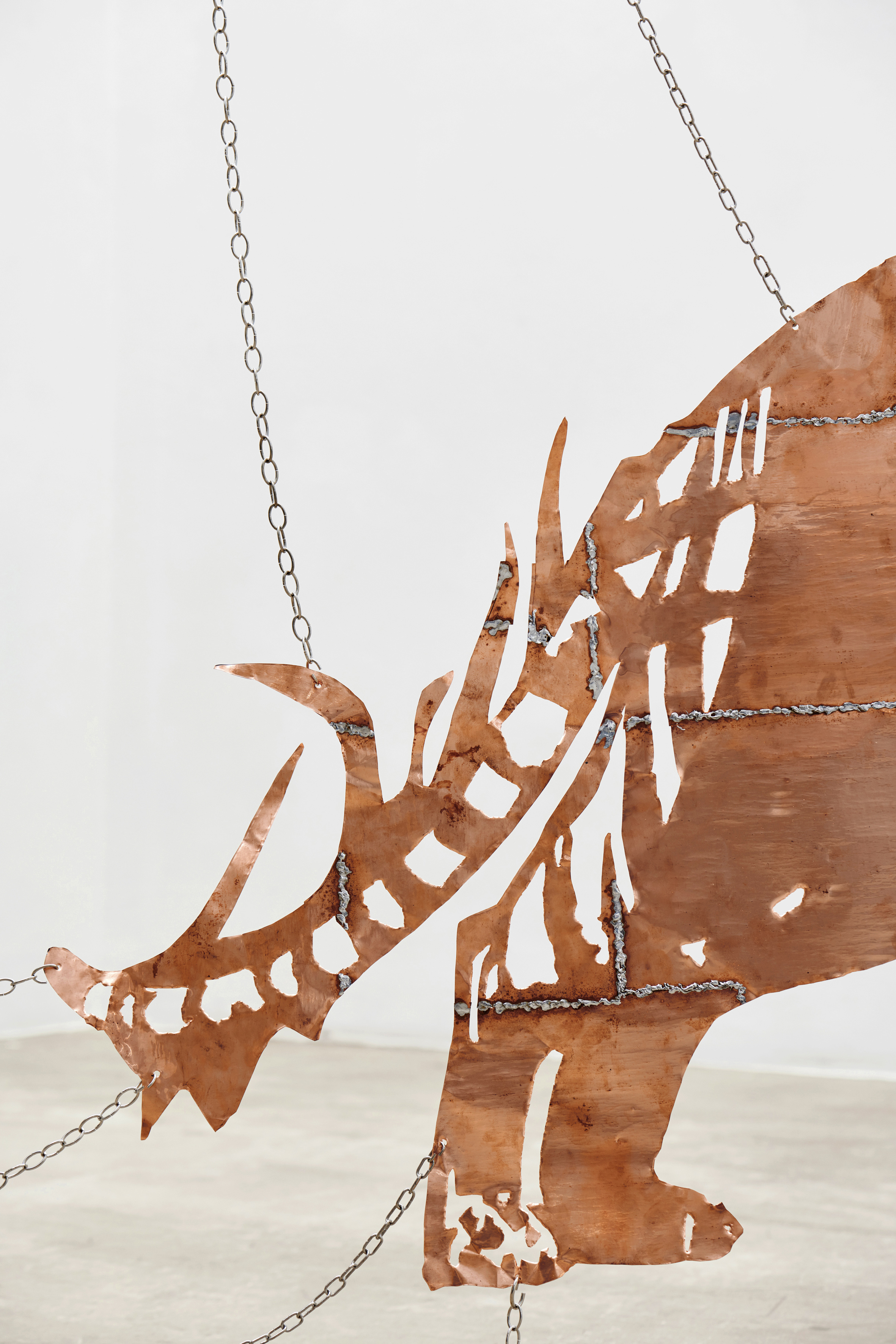 Spirit Animal II, 2019, Copper, solder, steel, stainless steel, jasper, plastic, hematite, 120 x 200 x 40 cm
