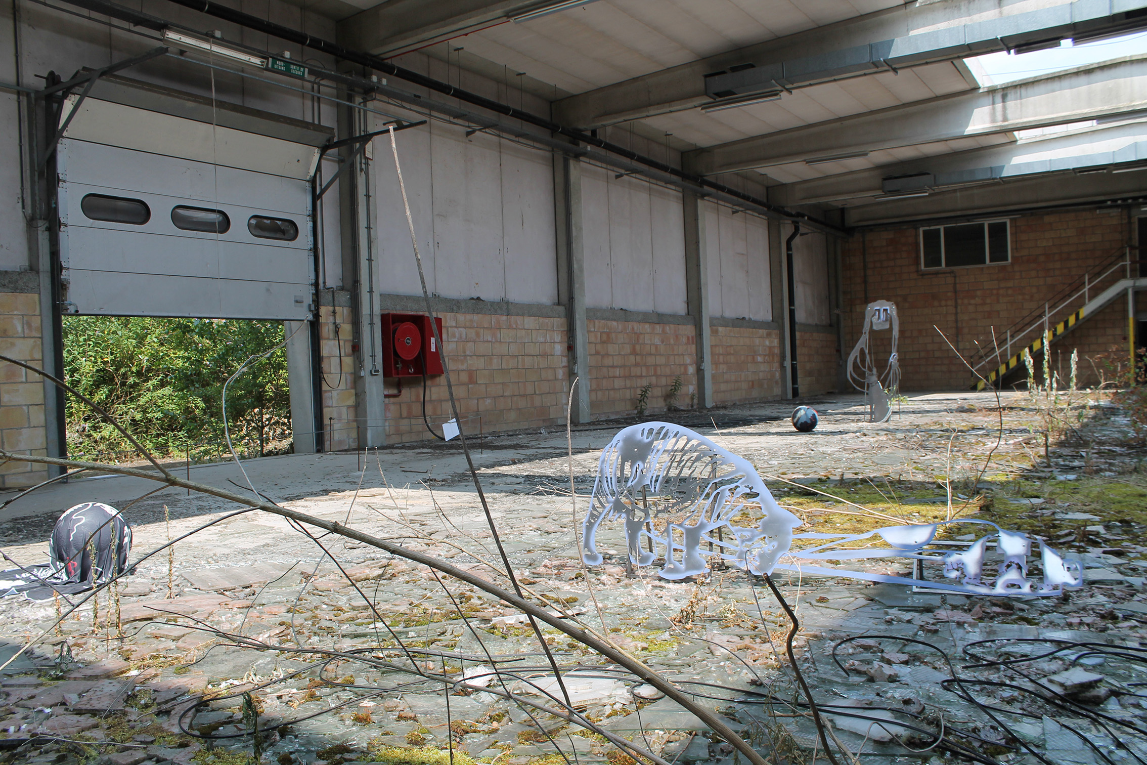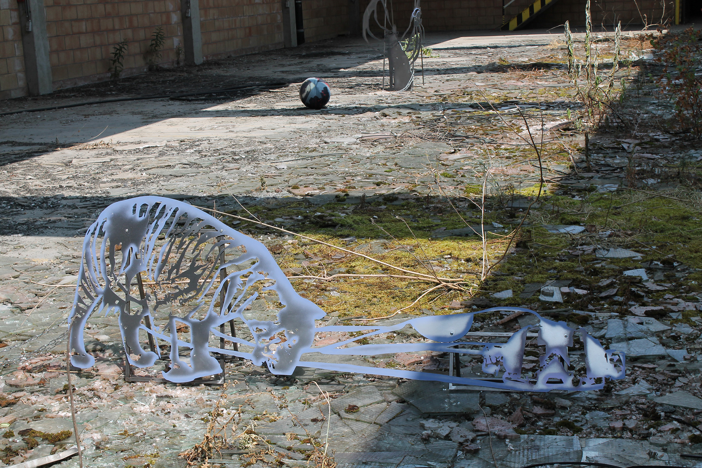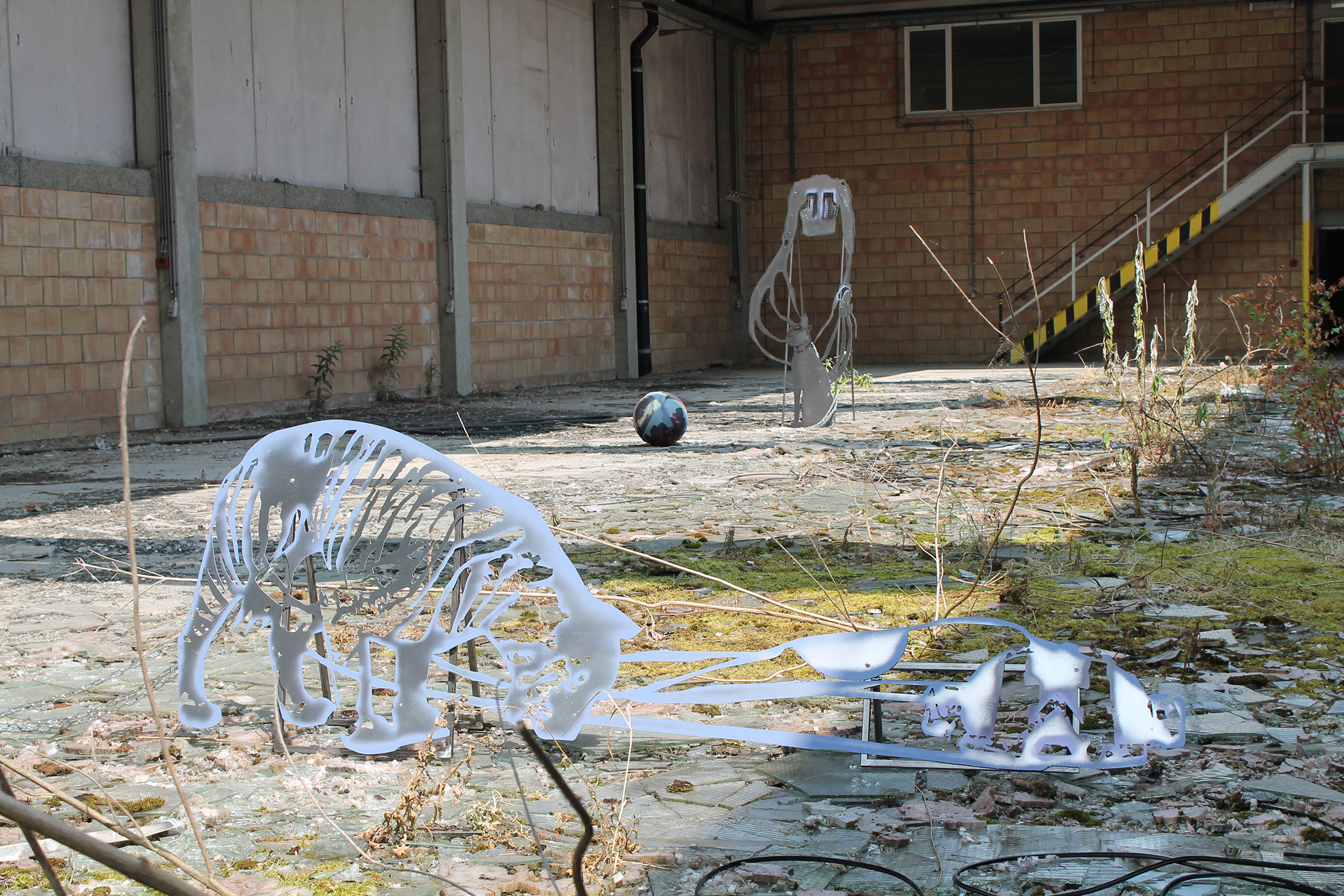 Fallen Empires and Refound DesiresCurated by Evelyn SimonsHorst Arts and MusicAsiat ex-military base, Vilvoorde - North BrusselsJuly 14 - Sep 8, 2019The practice of Lito Kattou is predominantly inspired by humanity’s longing for spirituality in a landscape informed by post-humanism and ecological crisis. Translating into an exchange between century-old belief-systems and contemporary forms of devotion, Kattou questions the holistic transverberation that is lived through a connection between geological matter and human or animal existence. She fuses analogue techniques such as for example metal welding and cutting, with digital fabrication of printed textiles, producing objects that exists as weapons, skins, cosmic elements, mythical creatures and animalistic beings. Kattou incorporates many references from literature, feminism, myths, science fiction and the history of science in her body of work, to arrive at an imagery that appears both archaeological, contemporary and futuristic. She experiments with flattened volumes to evoke both an absence as well as a presence of bodily awareness.An inside garden is being inhabited by a group of enigmatic creatures. They don’t appear alone, but carry or are themselves carried by armor-like objects. These wild animals seem to have abandoned their native landscapes, and are protecting themselves from the Sun with shields and ski-glasses. Their subdued struggle conveys and alters relationship with nature, and breath solitude. Recovering from an embodied trauma, they need to transform themselves, build a new bridge in order to be able to adapt, and coexist with each other in a mutated natural state.