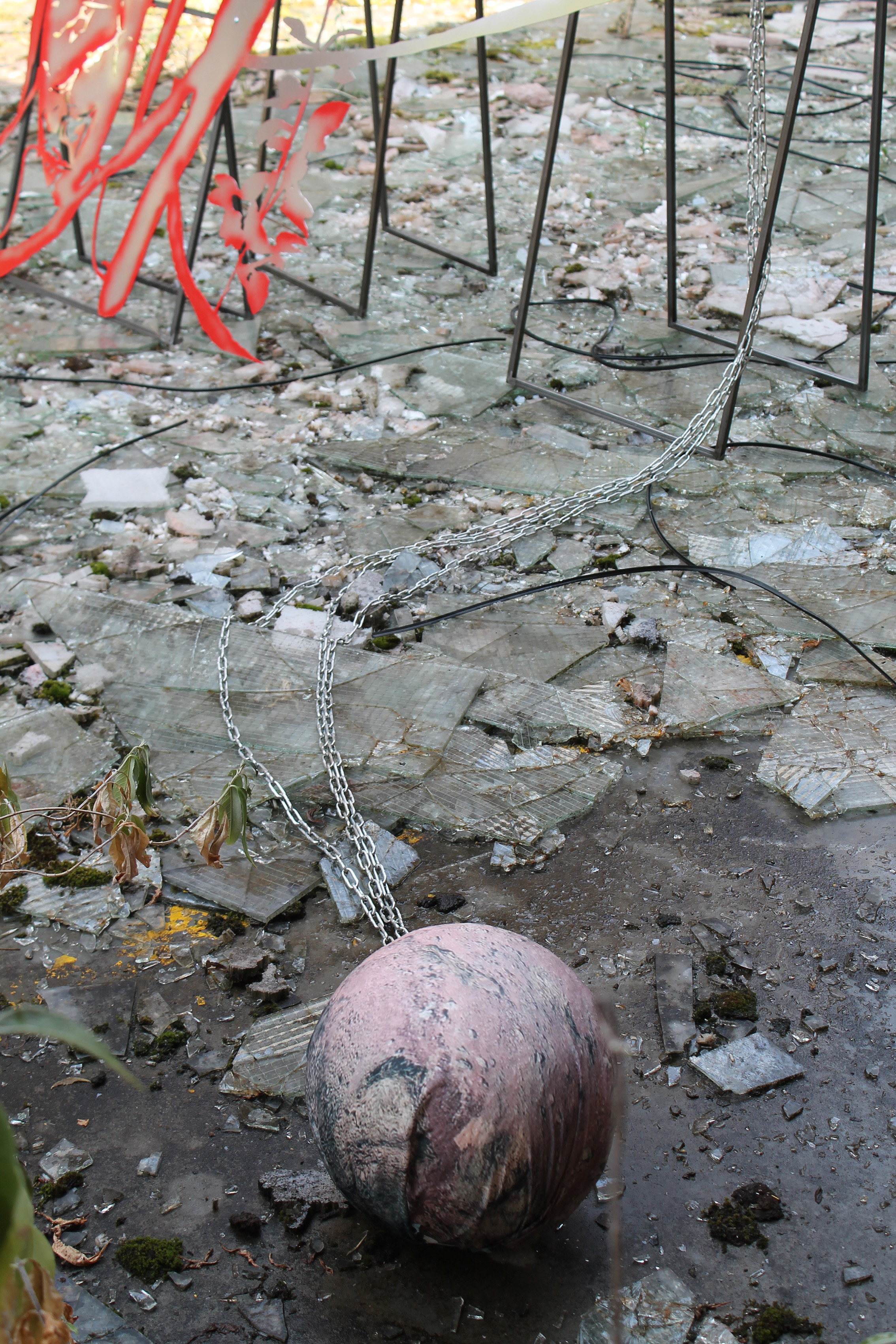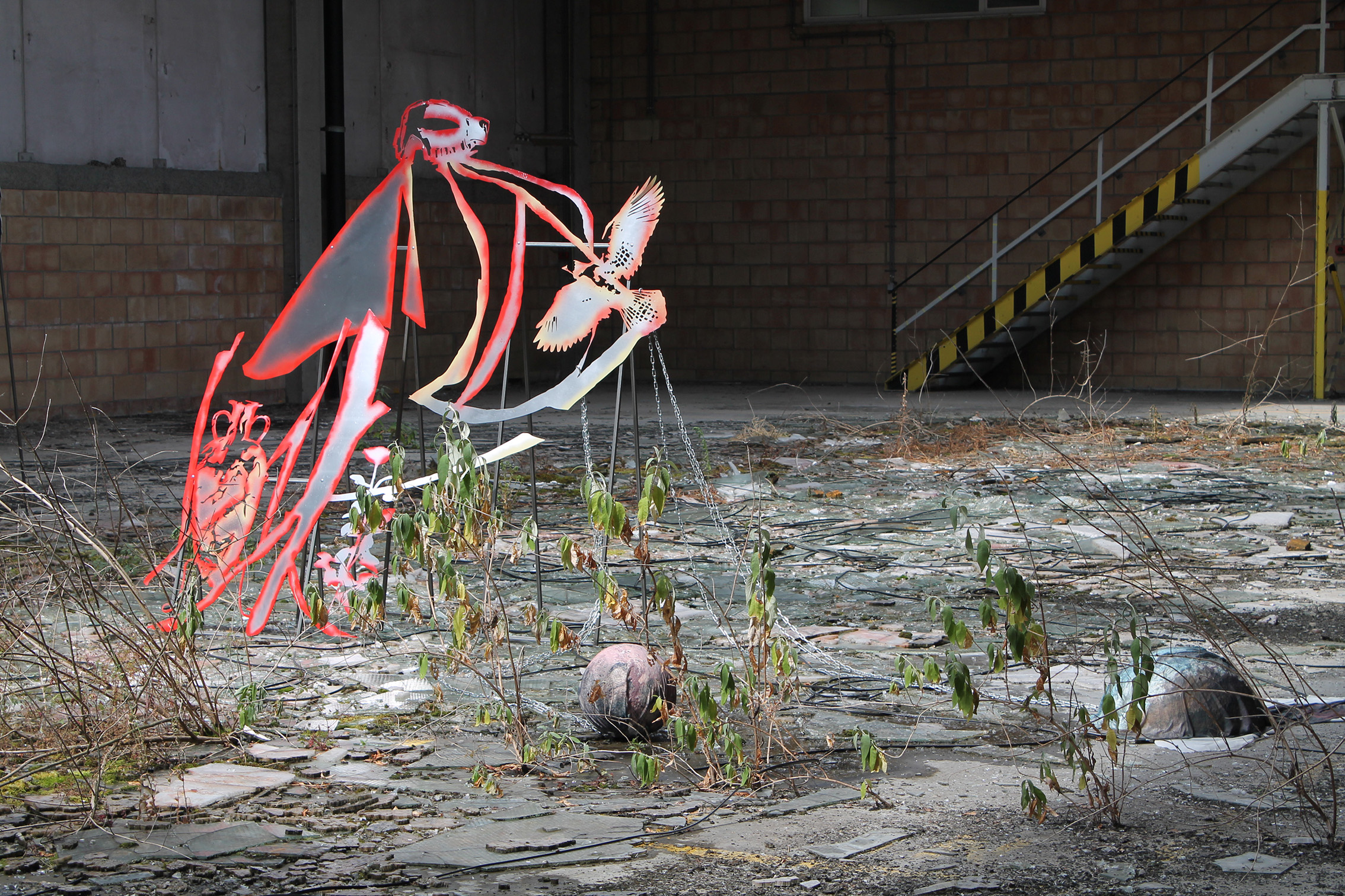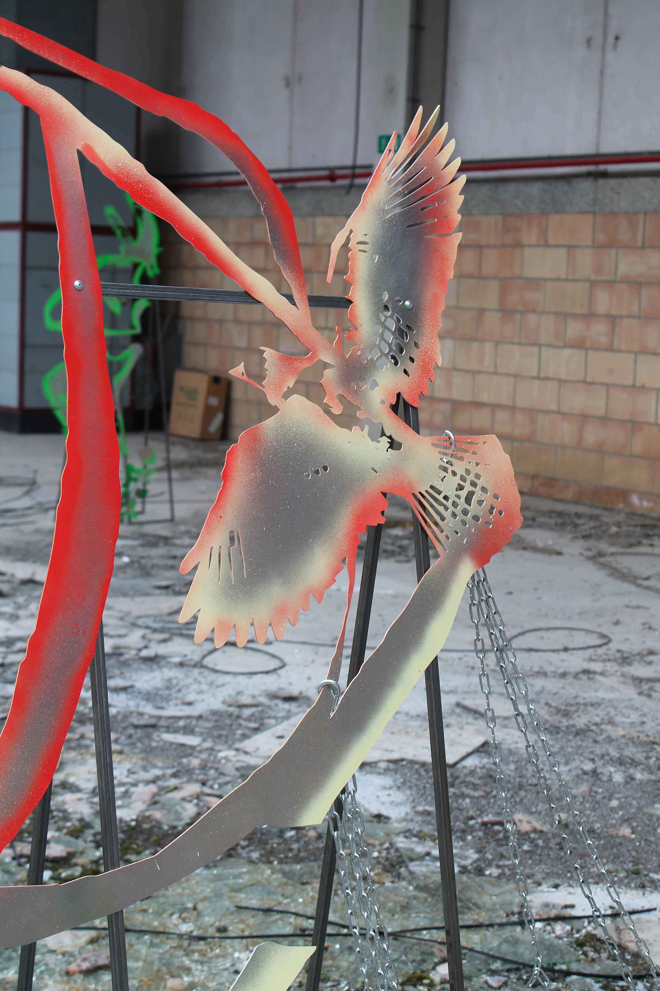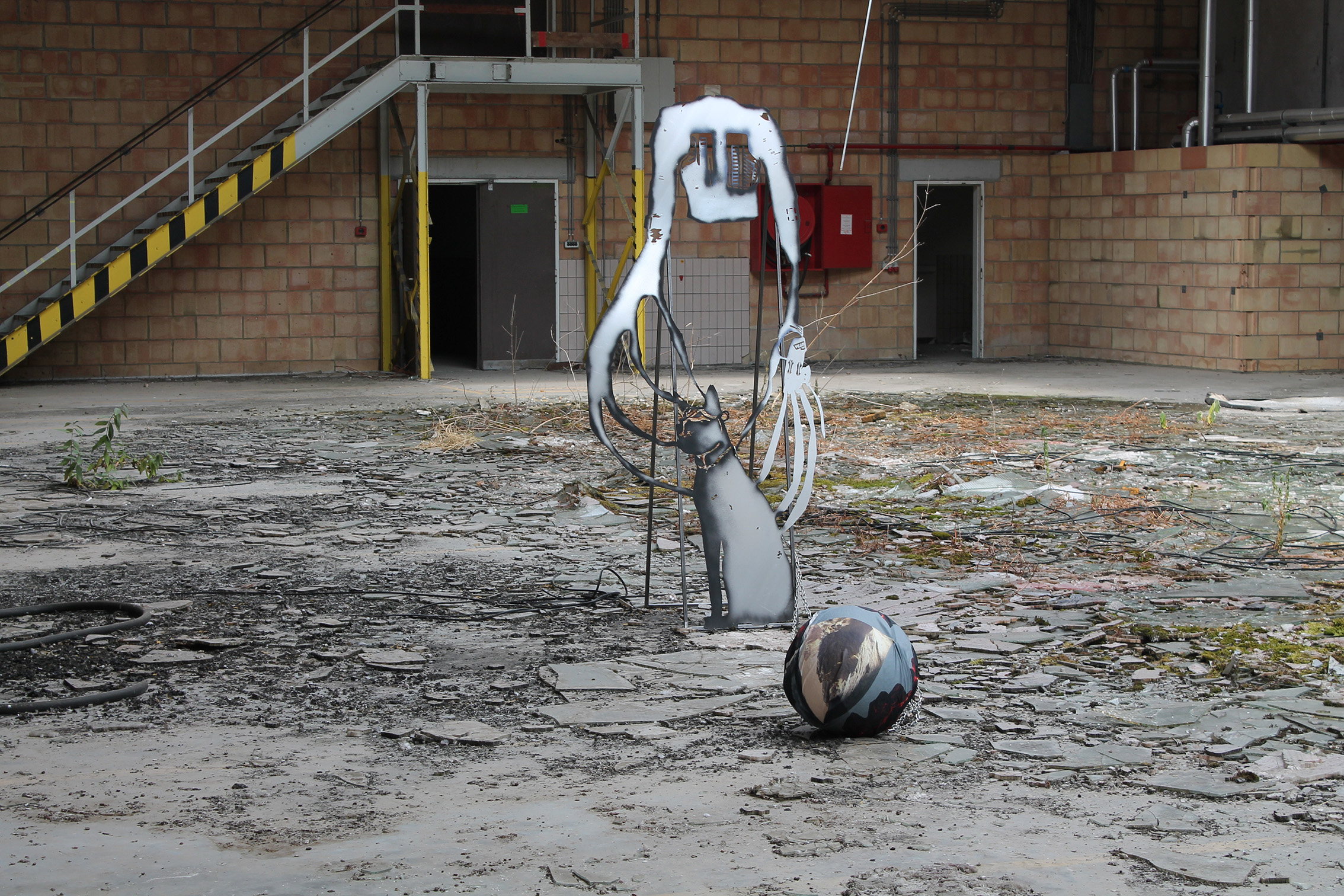 Fallen Empires and Refound DesiresCurated by Evelyn SimonsHorst Arts and MusicAsiat ex-military base, Vilvoorde - North BrusselsJuly 14 - Sep 8, 2019The practice of Lito Kattou is predominantly inspired by humanity’s longing for spirituality in a landscape informed by post-humanism and ecological crisis. Translating into an exchange between century-old belief-systems and contemporary forms of devotion, Kattou questions the holistic transverberation that is lived through a connection between geological matter and human or animal existence. She fuses analogue techniques such as for example metal welding and cutting, with digital fabrication of printed textiles, producing objects that exists as weapons, skins, cosmic elements, mythical creatures and animalistic beings. Kattou incorporates many references from literature, feminism, myths, science fiction and the history of science in her body of work, to arrive at an imagery that appears both archaeological, contemporary and futuristic. She experiments with flattened volumes to evoke both an absence as well as a presence of bodily awareness.An inside garden is being inhabited by a group of enigmatic creatures. They don’t appear alone, but carry or are themselves carried by armor-like objects. These wild animals seem to have abandoned their native landscapes, and are protecting themselves from the Sun with shields and ski-glasses. Their subdued struggle conveys and alters relationship with nature, and breath solitude. Recovering from an embodied trauma, they need to transform themselves, build a new bridge in order to be able to adapt, and coexist with each other in a mutated natural state.