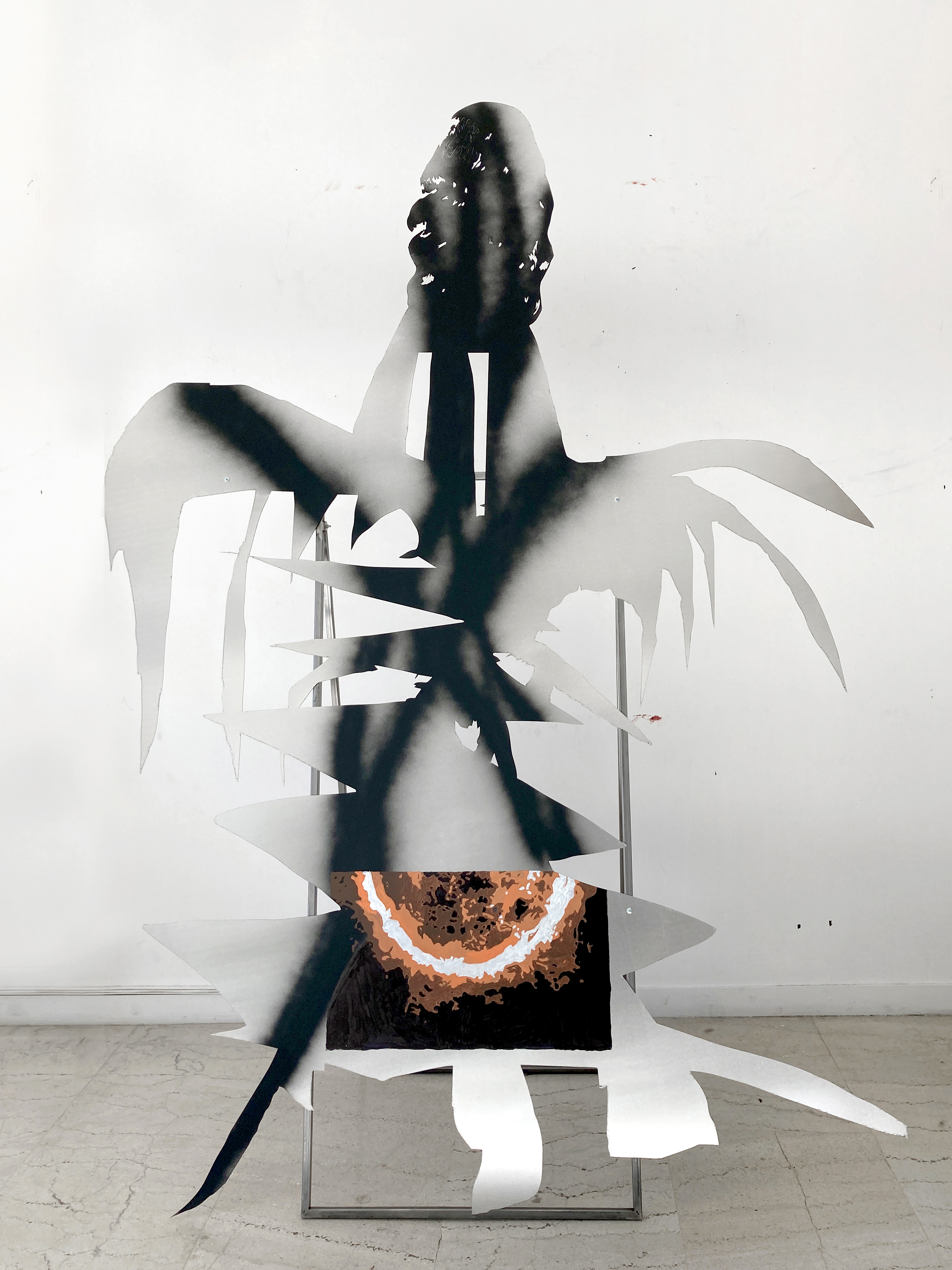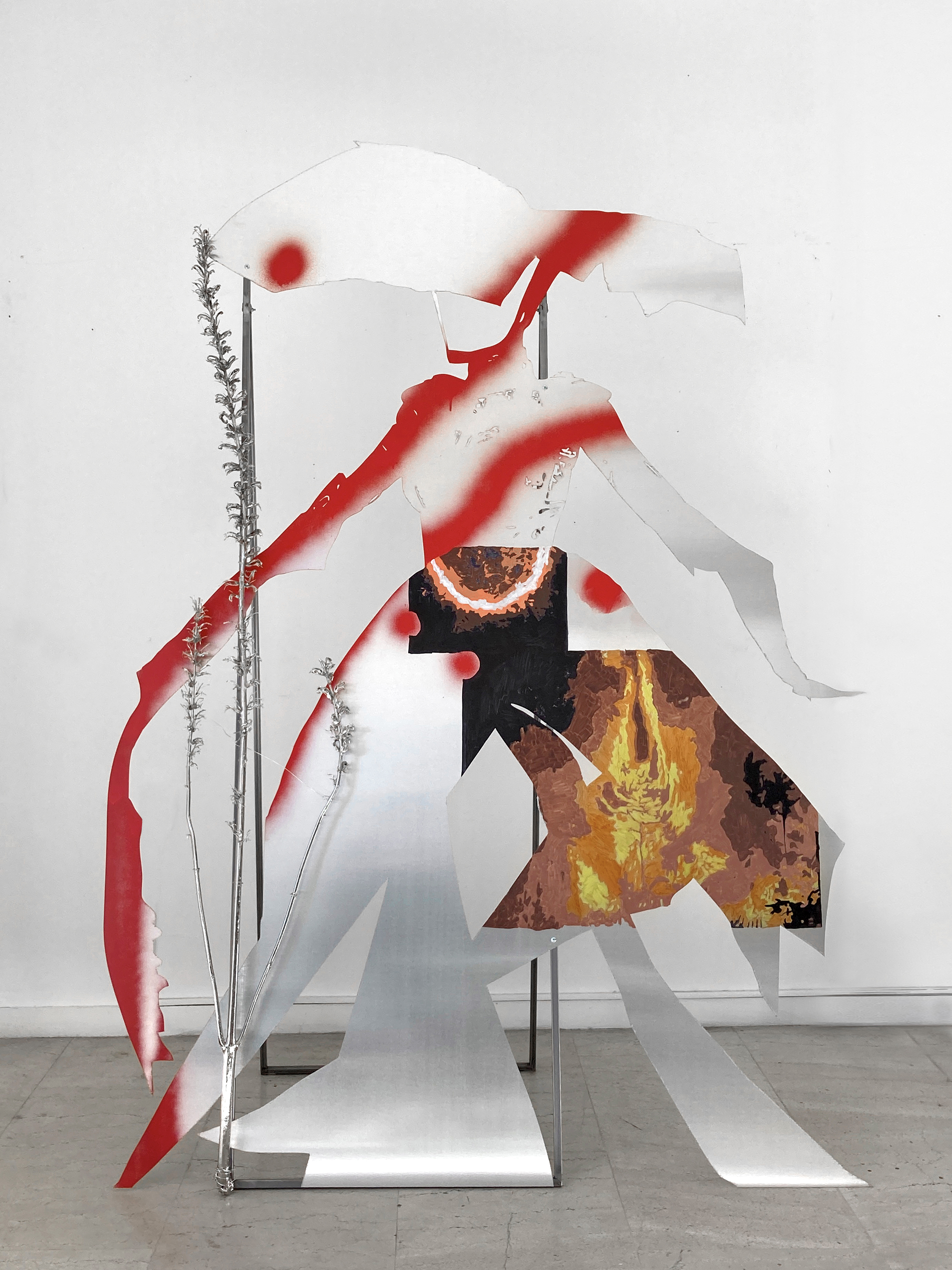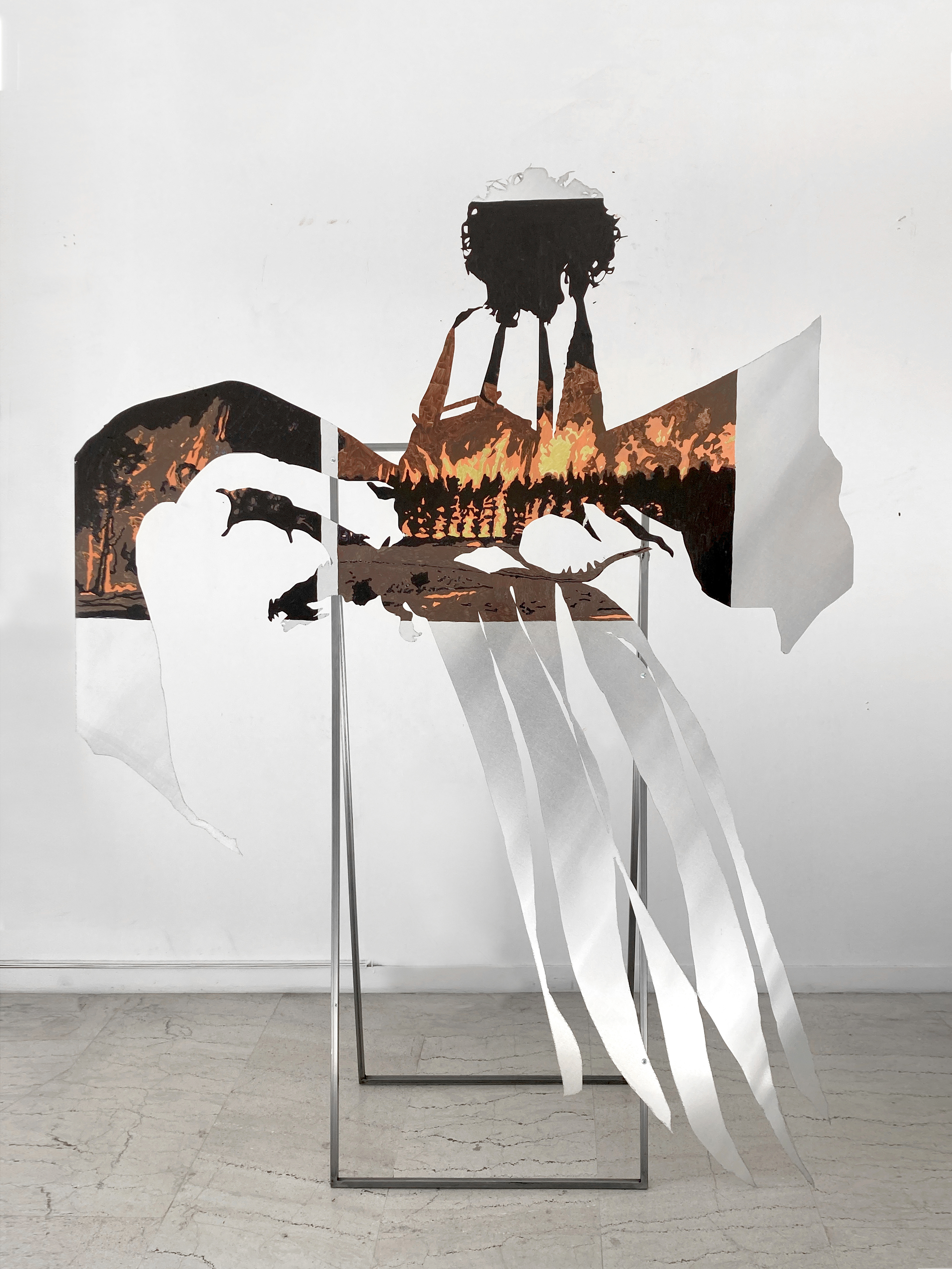 The installation Body X-XV consists of aluminum hybrid figures that resemble correspondents and solemn wanders at the same time. Continuing her series of works “Bodies”, the artist develops a cluster of two dimensional sculptures related to the warming climate of the Mediterranean. Structured from an assembly of human, technological and natural parts, the figures emerge as environmental beings. Although they cannot be identified with known characters or myths, the drawings and imagery on their epidermis reveal their geographic origins. The element of fire traced on the bodies implies that they have departed from turbulent locations, holding memories of wildfire incidents or being capable of healing affected places and traumas. These anthropomorphic but also eerie bodies are accompanied by elements that the artist collected at mediterranean regions; elements like thorns and baskets bear a physical remembrance of loss and ecological destruction but also a reality that is to be opposed by bodies captured in movement.*Commissioned and produced by Onassis Stegi