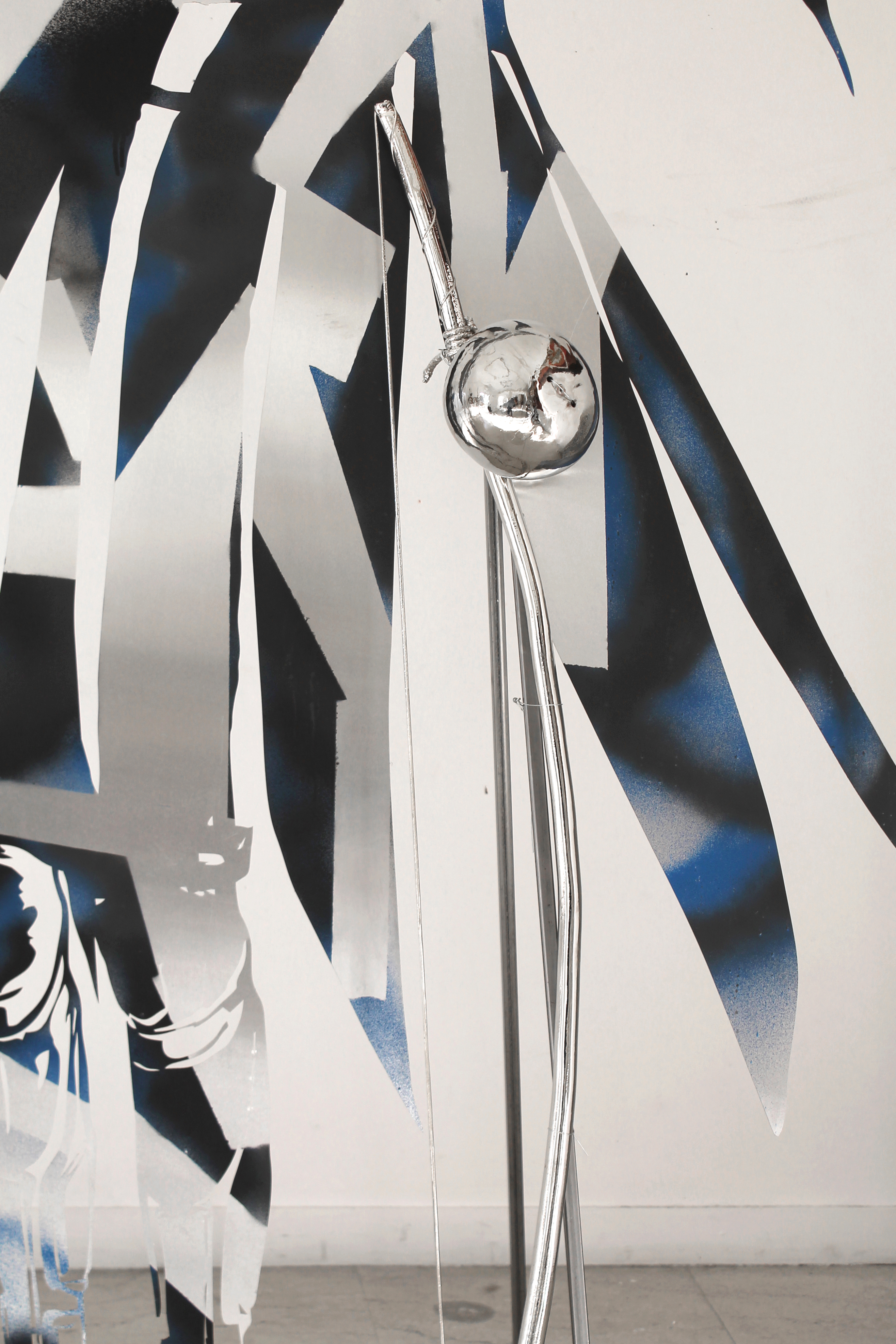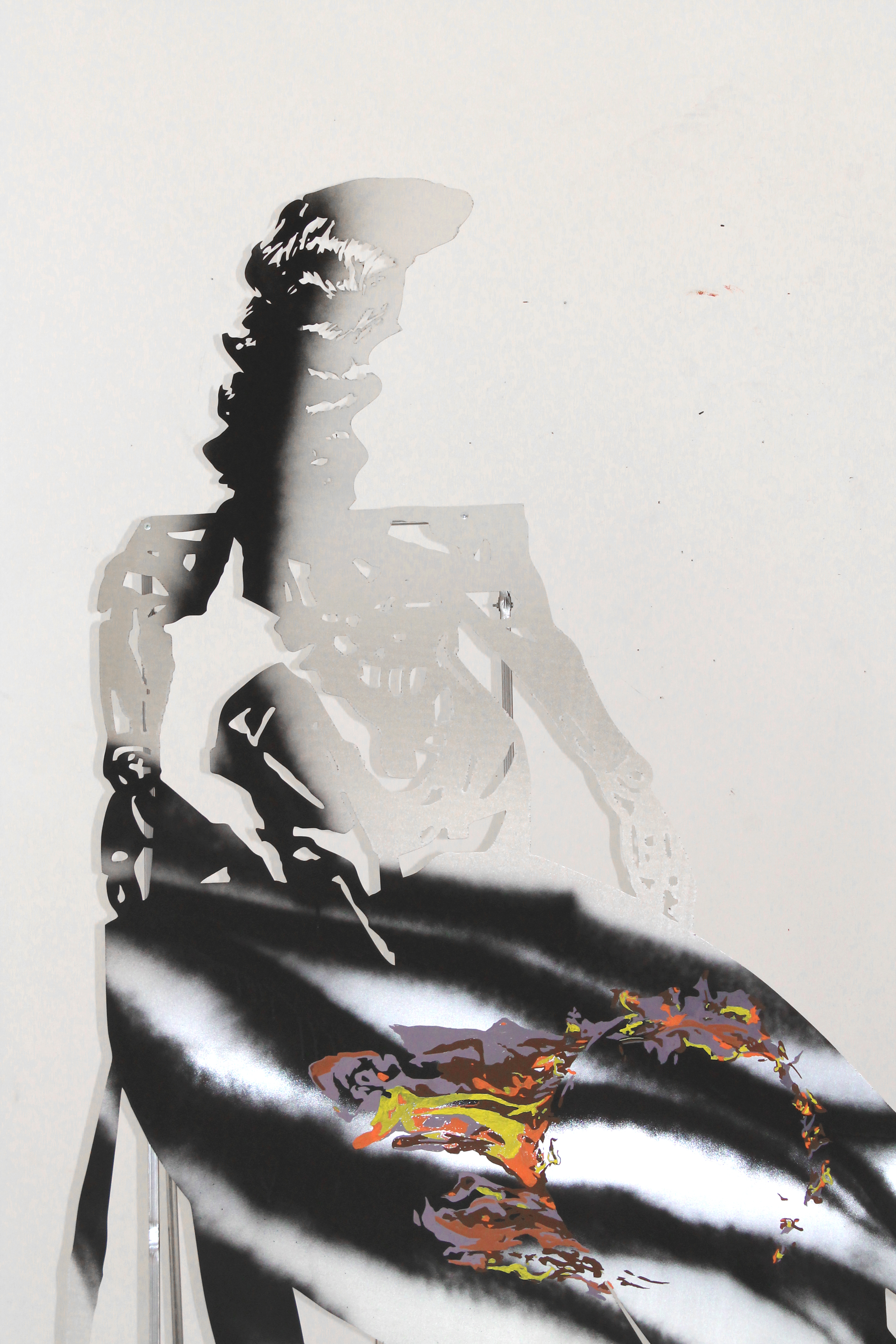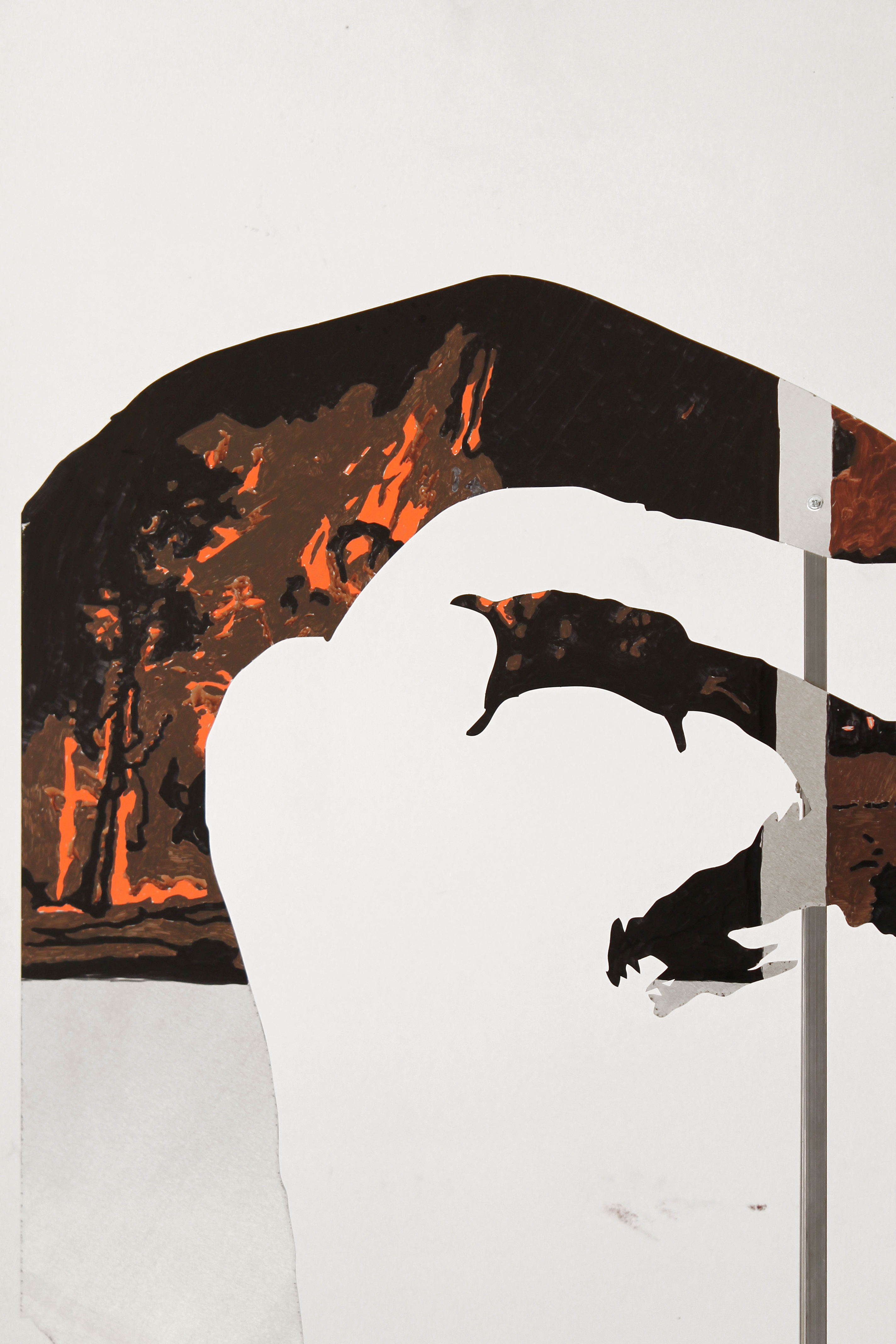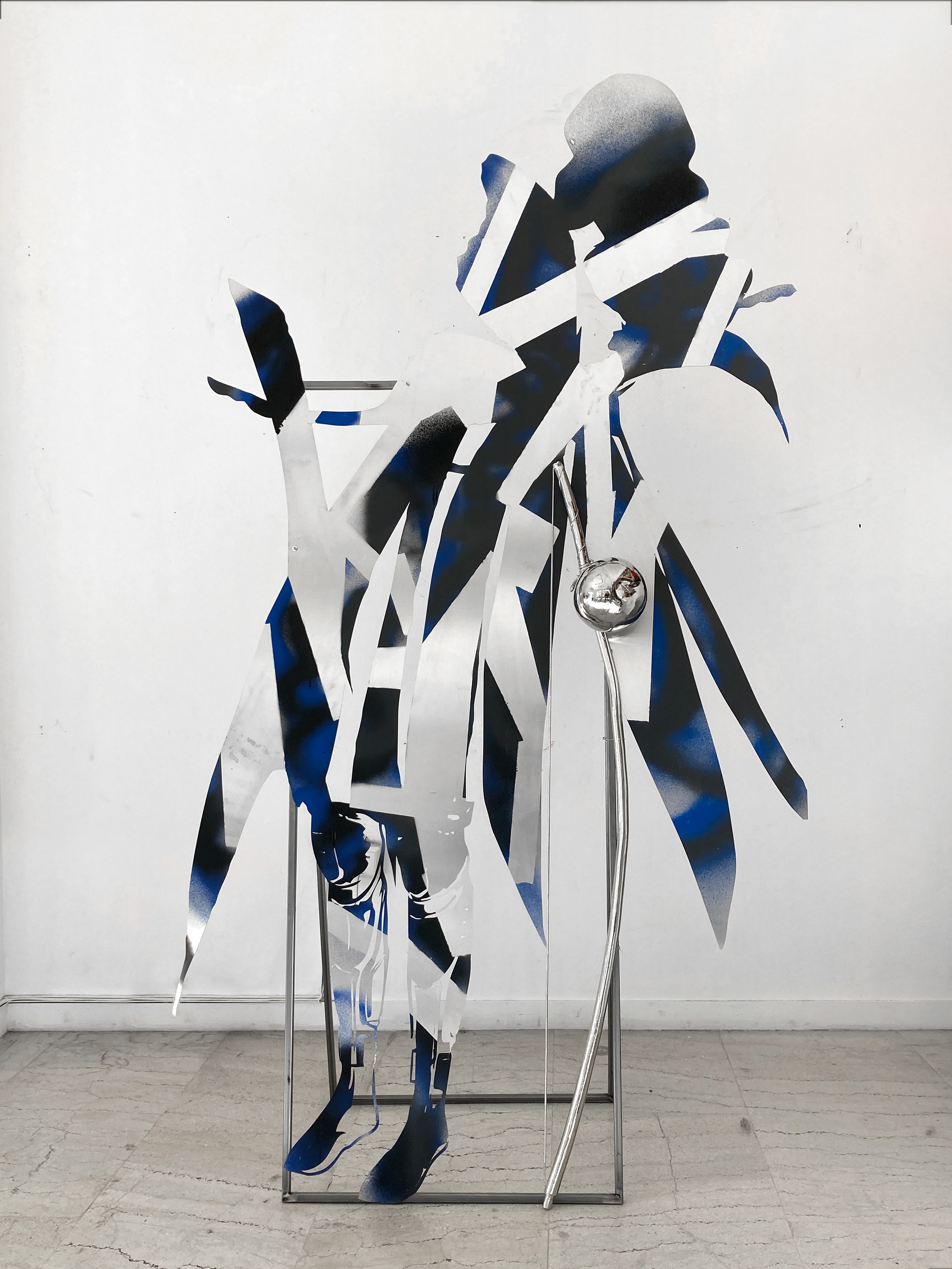 The installation Body X-XV consists of aluminum hybrid figures that resemble correspondents and solemn wanders at the same time. Continuing her series of works “Bodies”, the artist develops a cluster of two dimensional sculptures related to the warming climate of the Mediterranean. Structured from an assembly of human, technological and natural parts, the figures emerge as environmental beings. Although they cannot be identified with known characters or myths, the drawings and imagery on their epidermis reveal their geographic origins. The element of fire traced on the bodies implies that they have departed from turbulent locations, holding memories of wildfire incidents or being capable of healing affected places and traumas. These anthropomorphic but also eerie bodies are accompanied by elements that the artist collected at mediterranean regions; elements like thorns and baskets bear a physical remembrance of loss and ecological destruction but also a reality that is to be opposed by bodies captured in movement.*Commissioned and produced by Onassis Stegi