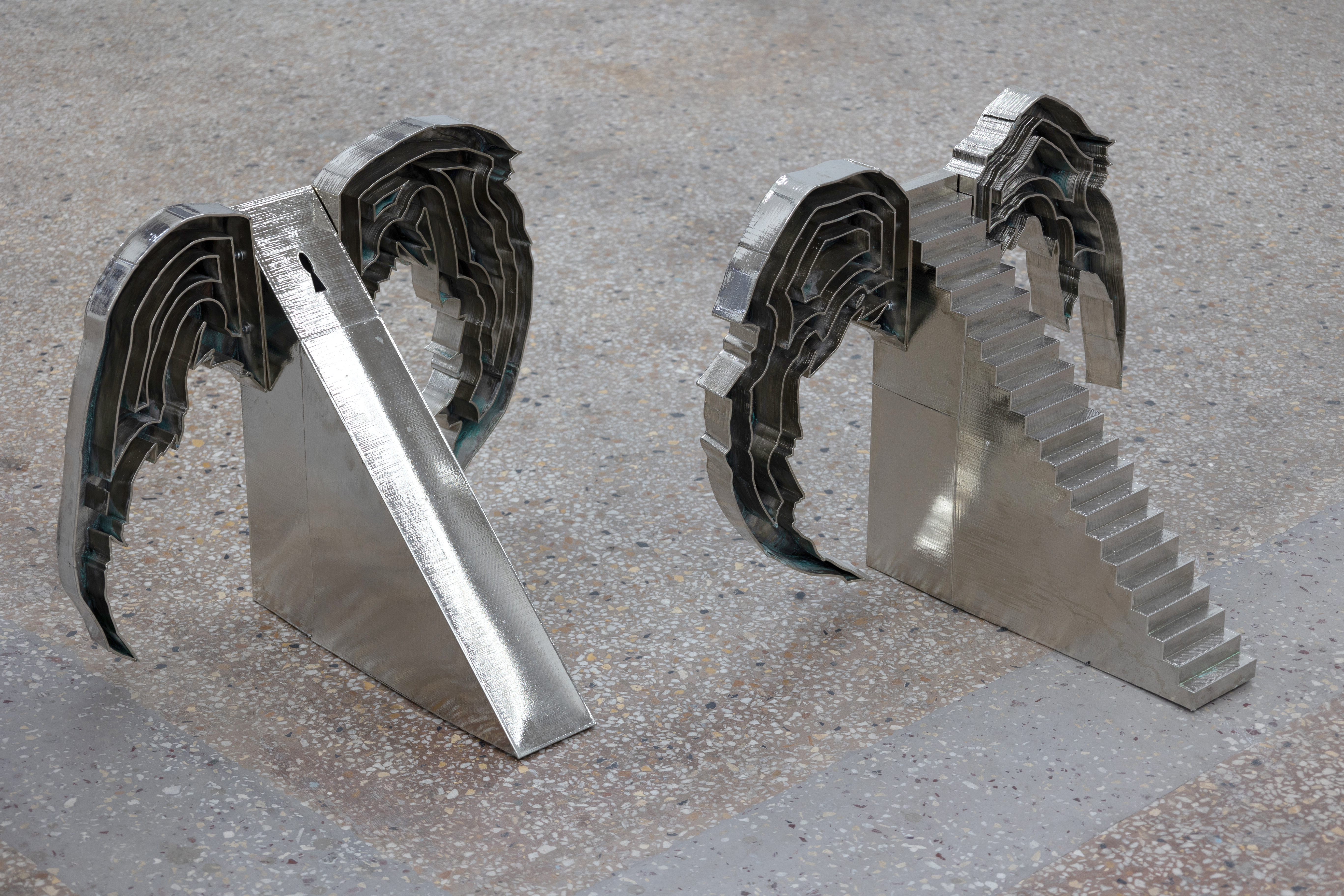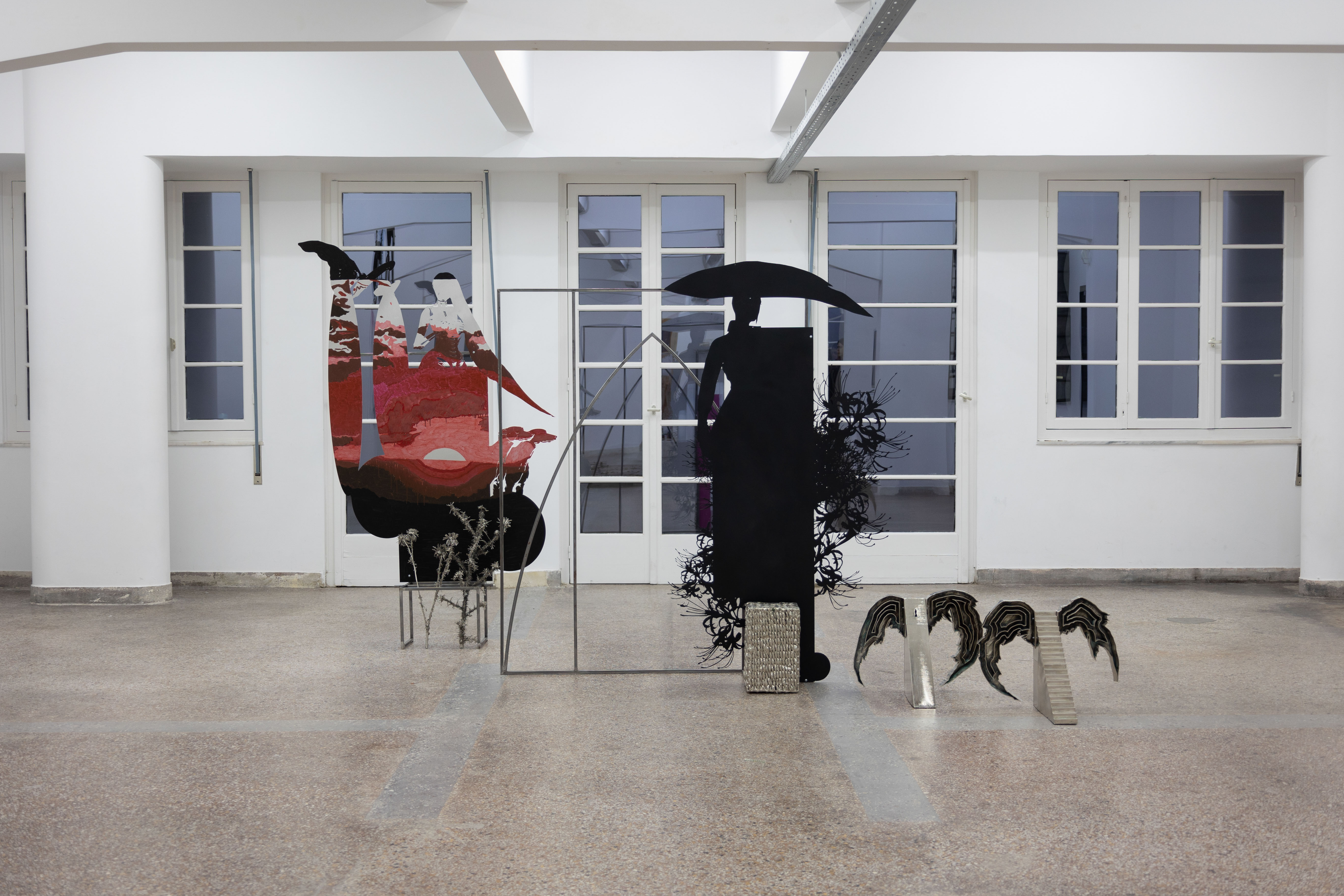 The works Sunset Gatherer (2023), Harvester I (2022) and Wingslocks (2024) come together in an installation under the title ‘Night Hour’ where they construct a mesh of fluid space-time. Shadow bodies perceived in the frontal plane and perpetual walkers carry with them relics of a nature they seek or may have lost. Thorny flowers - which the artist collects and transforms from organic to inorganic matter - are attuned to their bodies as imprints or carried along with companion animals in their wanderings.These weightless presences, whose volume is greatly reduced under the red hot sun - present in their constant dislocation, are perhaps manifestations of the same person in different conditions of their wanderings. Sunset Gatherer could be perceived for the context of the exhibition as a personification of Dido of Carthega, who thwarted by her love for Aeneas, suicides and wanders as a shadow in hell. She meets him there again in the Night when he descends to Hades to speak with his dead father. Relics or signs of architecture are both her personal shelters and the portals of her movement between worlds. Following Dido in her various guises, demons, angels, souls, or other disembodied manifestations of herself, unlock her arrival or departure in landscapes of her psyche or in territories of self-fulfilment.__photos: Lila Efremidou