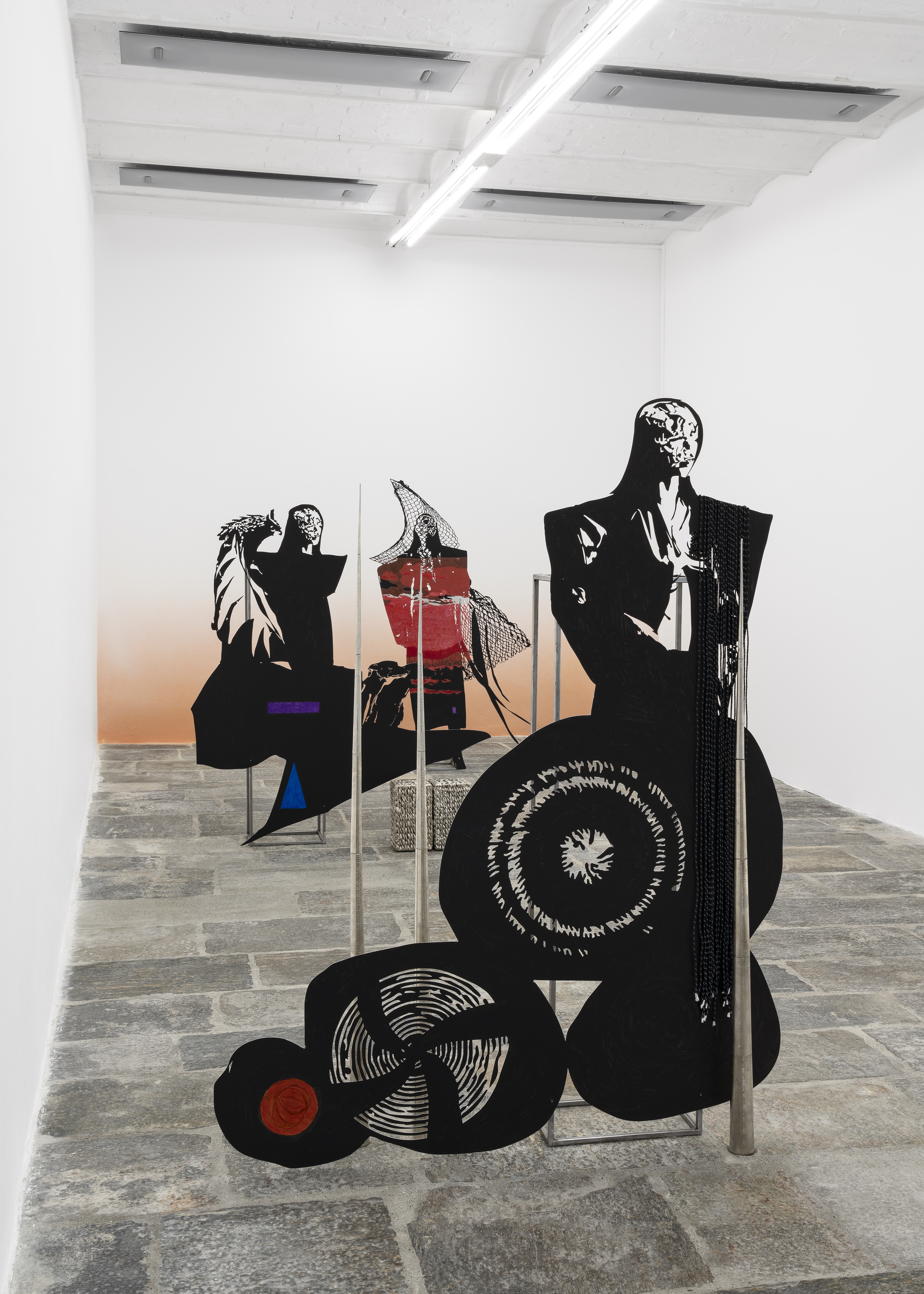 Whisperers is the first solo exhibition in an Italian institution by Lito Kattou, whose research is influenced by the natural, social and political context of the Mediterranean region. Inspired by local mythologies, stories and archaeologies, into her practice the artist has inserted themes such as the reconciliation between life and death and acceptance of the linearity and circularity of time, through which she reflects on the coexistence of different realities. Her works – bodies, hybrid and abstract creatures, anthropomorphic or animal, incorporated within which are natural and cosmic elements - analyses the process of changing matter in time, the theme of otherness and unknown space-time scenarios. The series Whisperers from 2022, like the previous Harvesters focuses on the idea of community in a timeless setting that identifies new strategies of coexistence. For the spaces of the Fondazione Pomodoro the artist has created Whisperer I, II, III and IV, four imposing sculptures made of aluminium, steel, acrylic, nickel-plated copper and biodegradable plastic, representing four components of a community – linked together by symbols, signs and fragments composing a familiar grammar – connected to Whisperer V, a fifth sculpture mounted on the façade of the Fondazione ICA Milano, an intervention acting as a bridge between the two institutions, thus solemnly establishing the collaboration. In the sculptures, Kattou assimilates human and non-human elements, figures deriving from nature and the animal world, in an attempt to imagine a new form of existence constantly adapting and transforming with the surrounding environmental forces. All endowed with the same face, in a frozen landscape at sunset, the black surfaces of the bodies, arranged so as to mark out the space structuring the route for the public, are interrupted by painted parts that highlight some of their gestures, accompanied by figures of animals, flowers and butterflies, woven baskets recalling not only the artist’s origins, but also the Cypriot colonial period. The basket is the cue for a broader reflection on the cultural evolution of humanity: as writer Ursula K. Le Guin states in The Carrier Bag Theory of Fiction (1986), “the first cultural device was probably a recipient ...and that the earliest cultural inventions must have been a container to hold gathered products”. A vision that disempowers the object-weapon as the main element of evolution and instead tells a story of support and collaboration, of intelligence and common practice used to the benefit of the community. Whisperers represents a space where it is possible to accept coexistence with different entities and to imagine alternative approaches and methods for living together, within a perspective that places the community at the centre and increases the awareness of the needs of other species and for the safeguarding of the planet. Chiara Nuzziphotos: Tiziano Ercoli | Andrea Rossetti