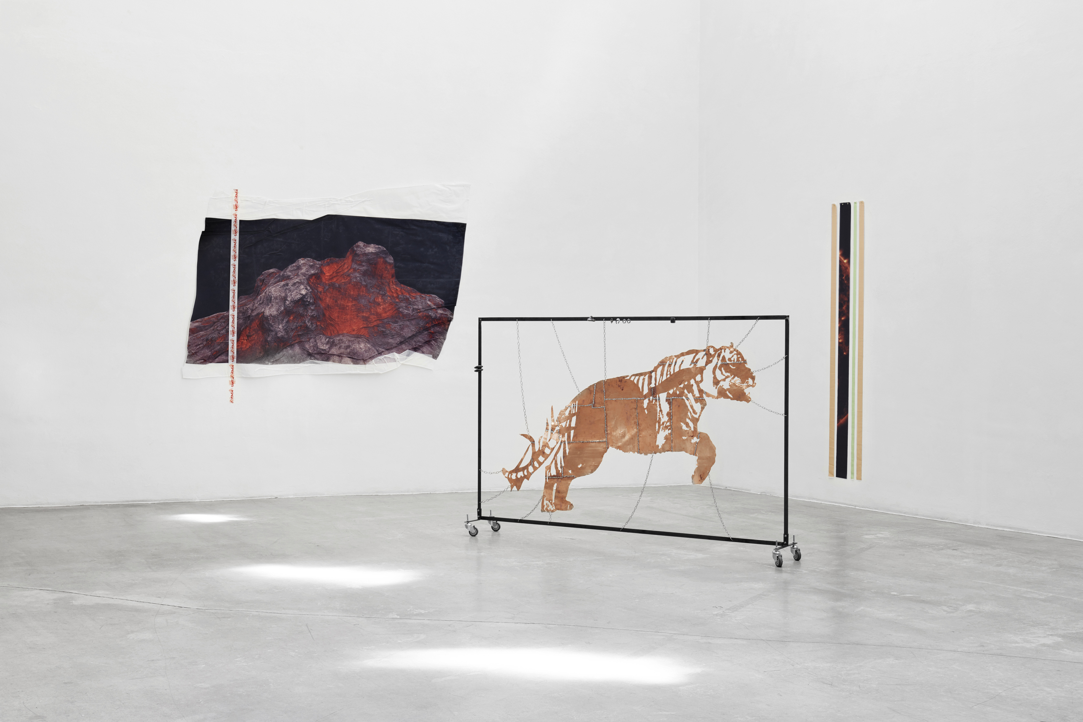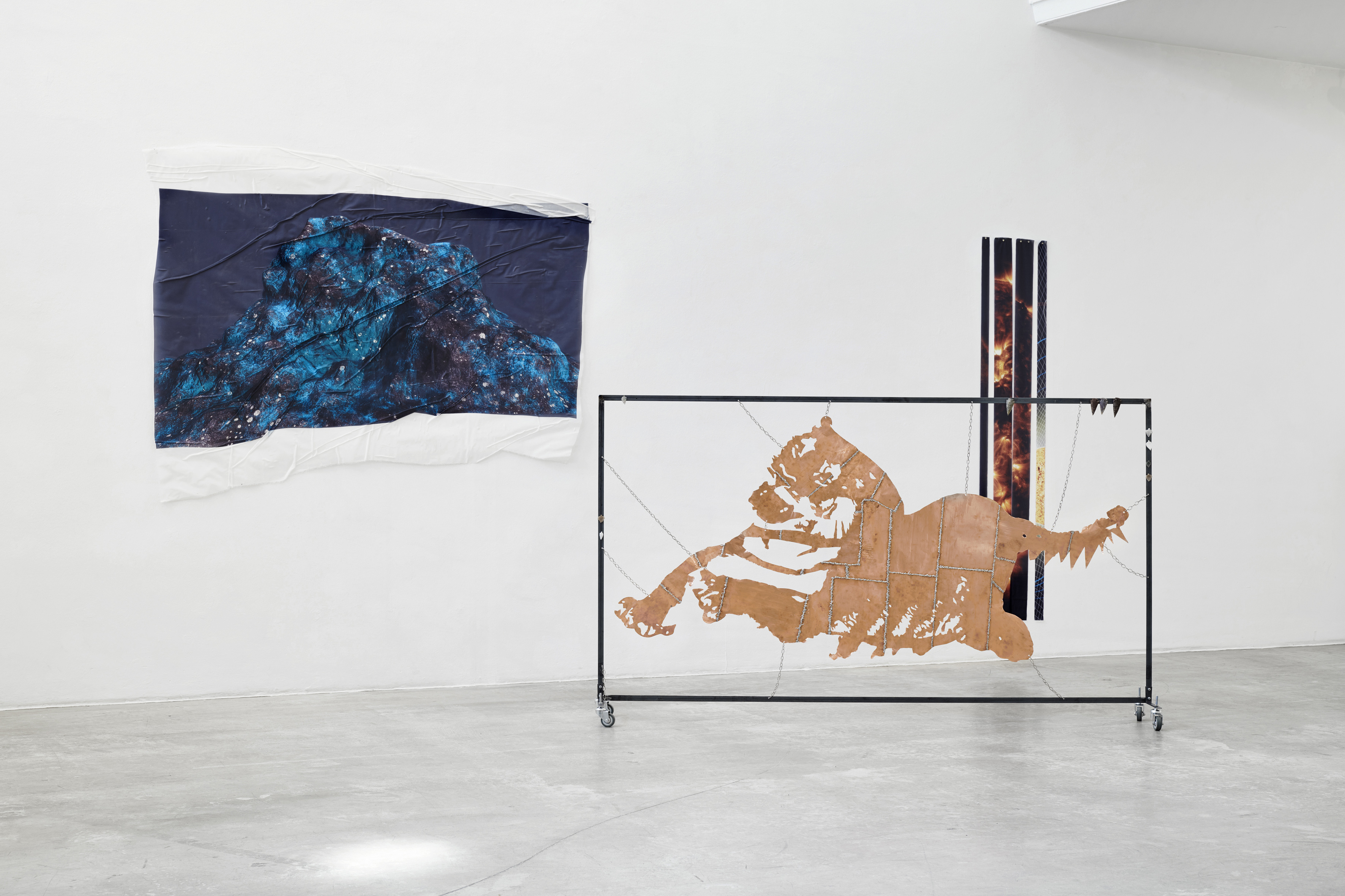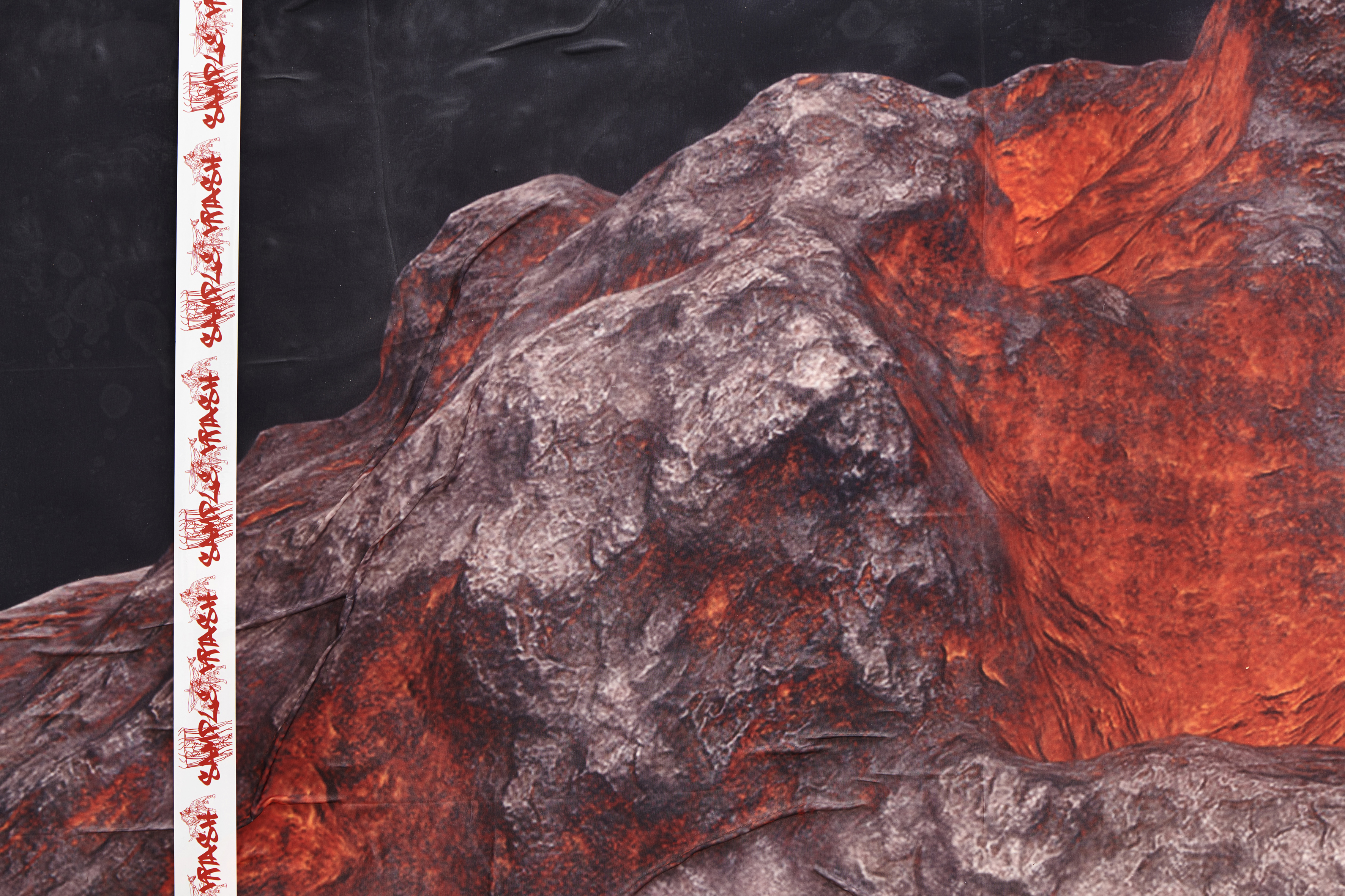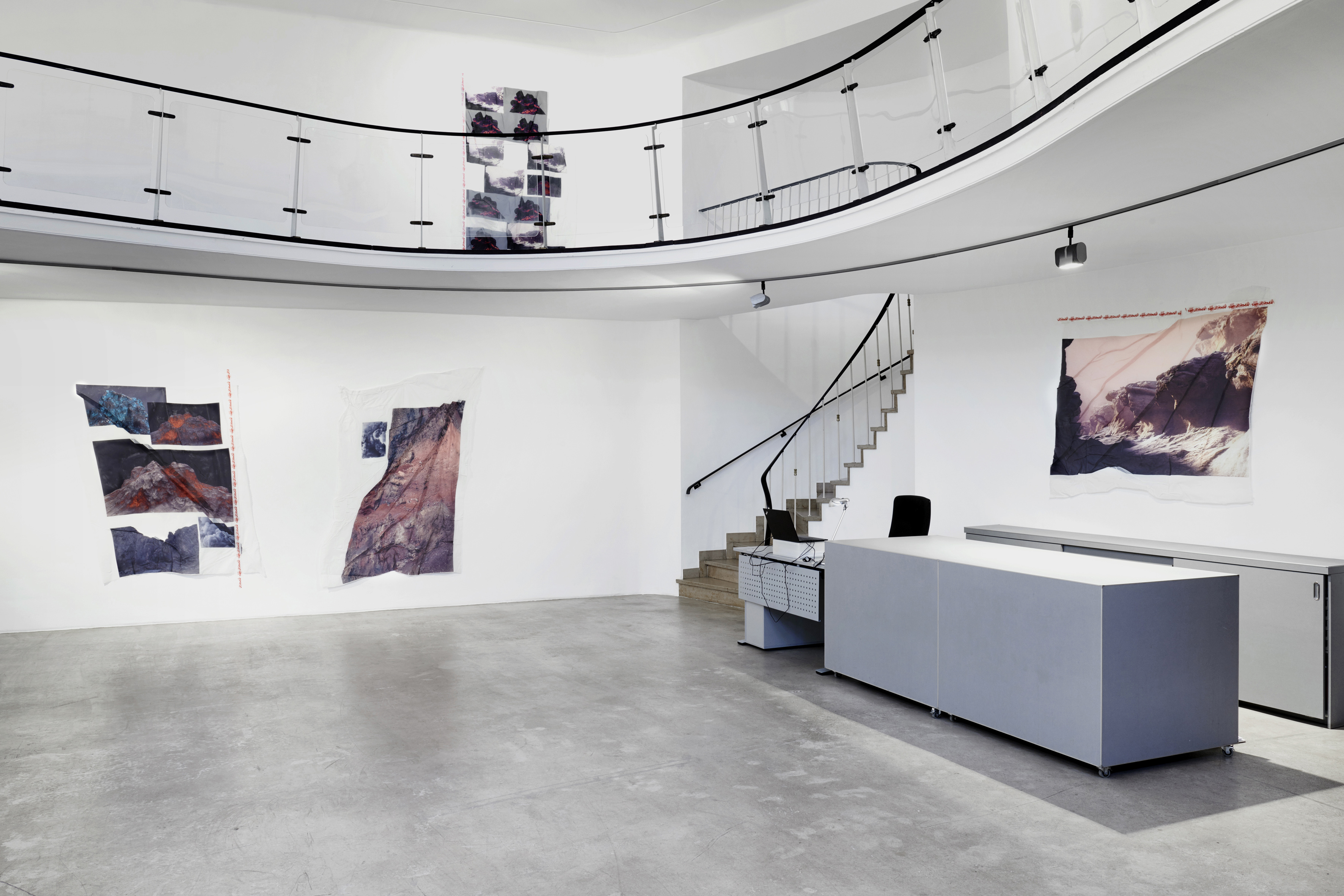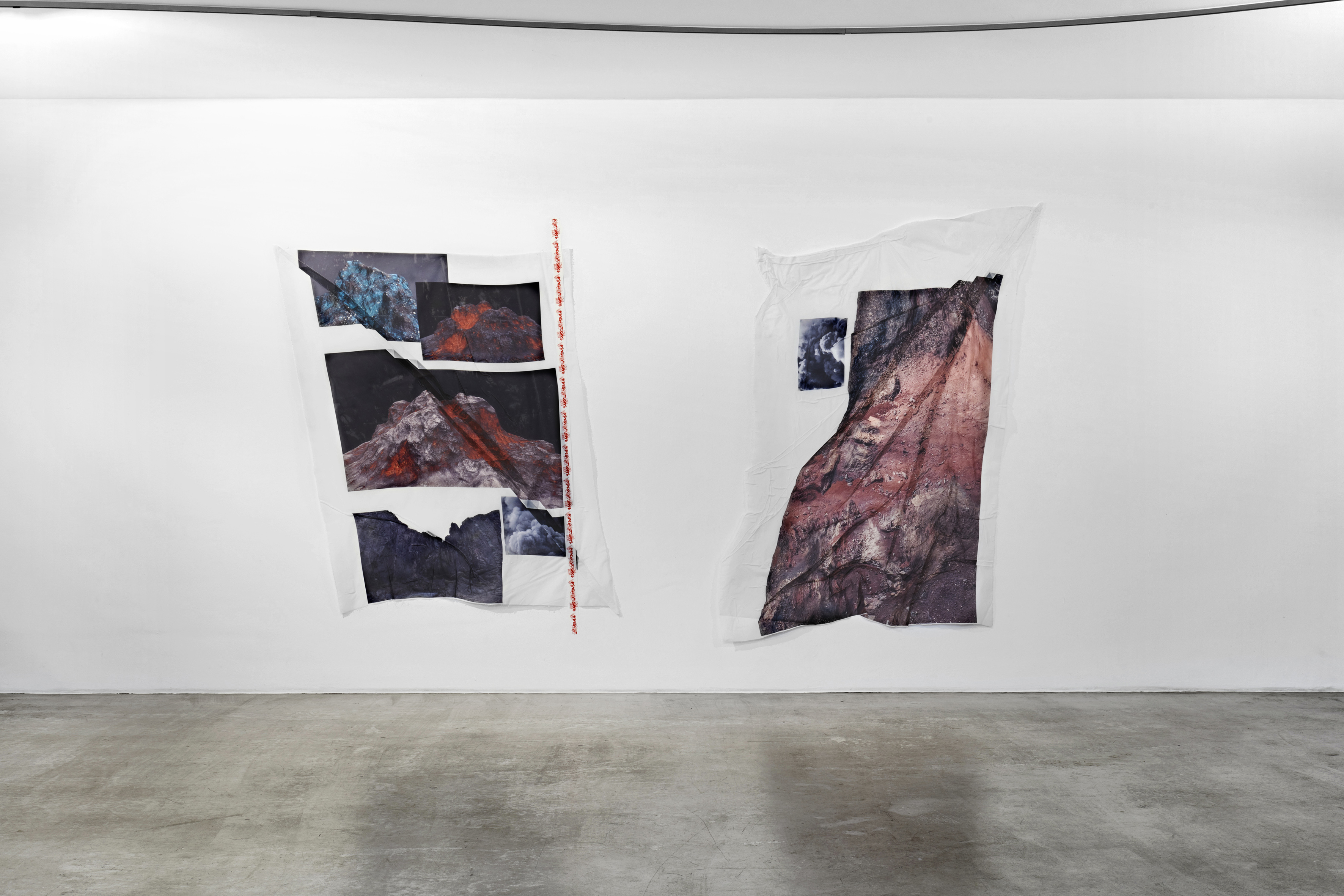 Empty AfternoonsArthotek, CologneMar 13 - Apr 12, 2019Bodies are now absent. Beings in constant redefining have abandoned their weaponry. The surrounding landscapes have probably absorbed their bodies… All these paths and roads they have taken and walked… And then, all of a sudden, the majestically standing mountains, volcanoes and rocks have incorporated those fighters in their multi-layered structures. An absolute captivation, where organic matter flows back in inorganic matter and what is “technology” is spitted out at the top layer. Now, in solitude, those new body-personified landscapes are more present than ever and so they will pursue continuity in deep-time existence. Still geological forms and bodies/monuments in transcendence, boiling, frustrated voices of matter. Frozen? Is it Gaia in a slightly aggressive or extroverted mood? They are standing there waiting for the next reaction, the next millimetres of transformation in their own understanding of volume and time."Empty Afternoons" brings together a new series of works by Lito Kattou, continuing the development and research of her interests in posthumanism, ecological concerns, non-patriarchal understanding of matter, moments of transformation, the absence and presence of the body, modes of roaming and intimate communication and flatness as a an articulation of volume. The symbolic power of what a mountain/volcano and a bow could be is revealed and unfolds through the personification of the landscape. All wall pieces are digital incarnations of rocky geological terrains captured in various angles, taken from 3D models through simple screenshots and then saved on her desktop. The images are digitally printed on synthetic textiles. The lightness and transformability of the textile as a material solidifies by a chemical component. The terrains are captured in a moment of unfolding or stretching out and in this way petrified textile, flat wall sculptures are created.