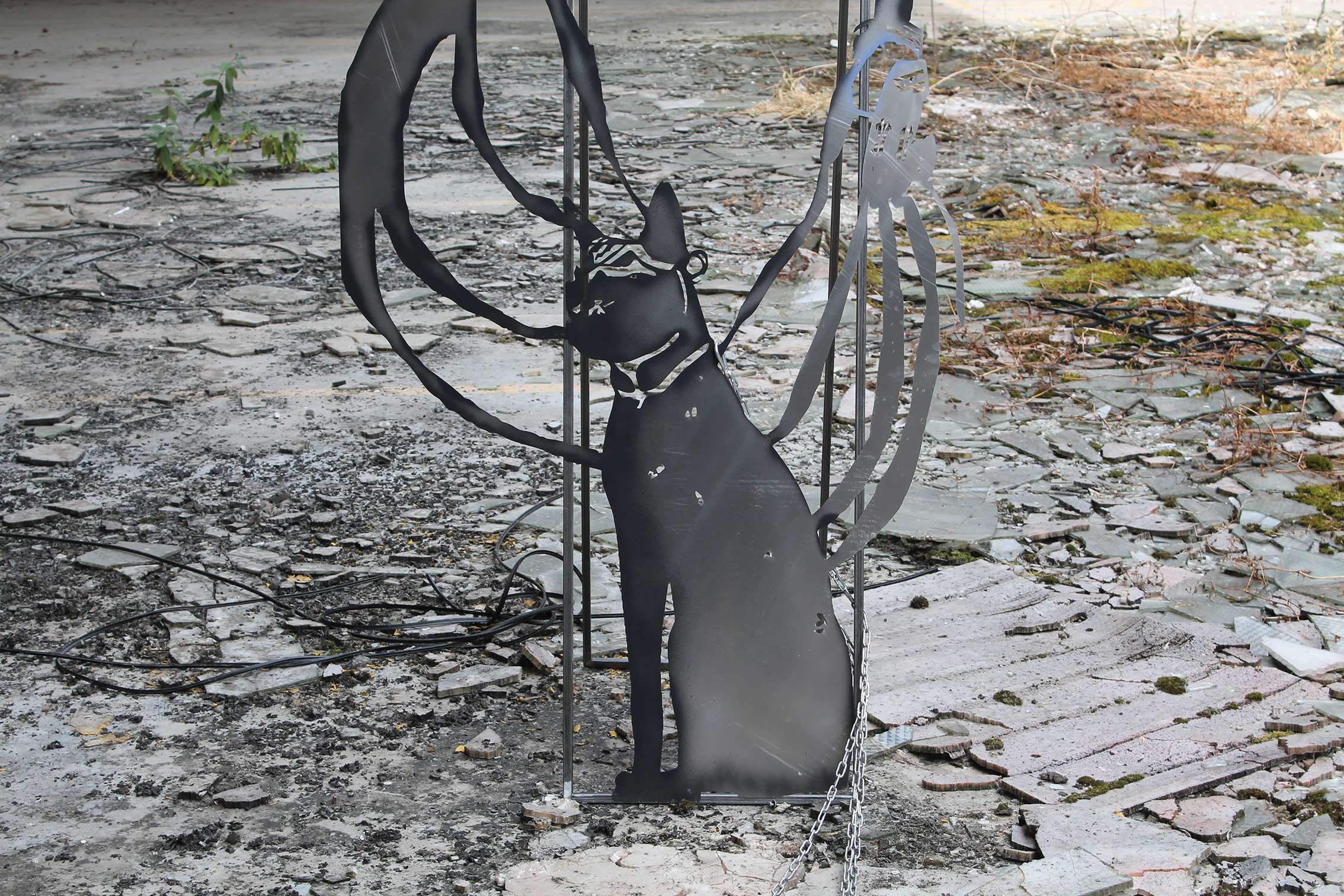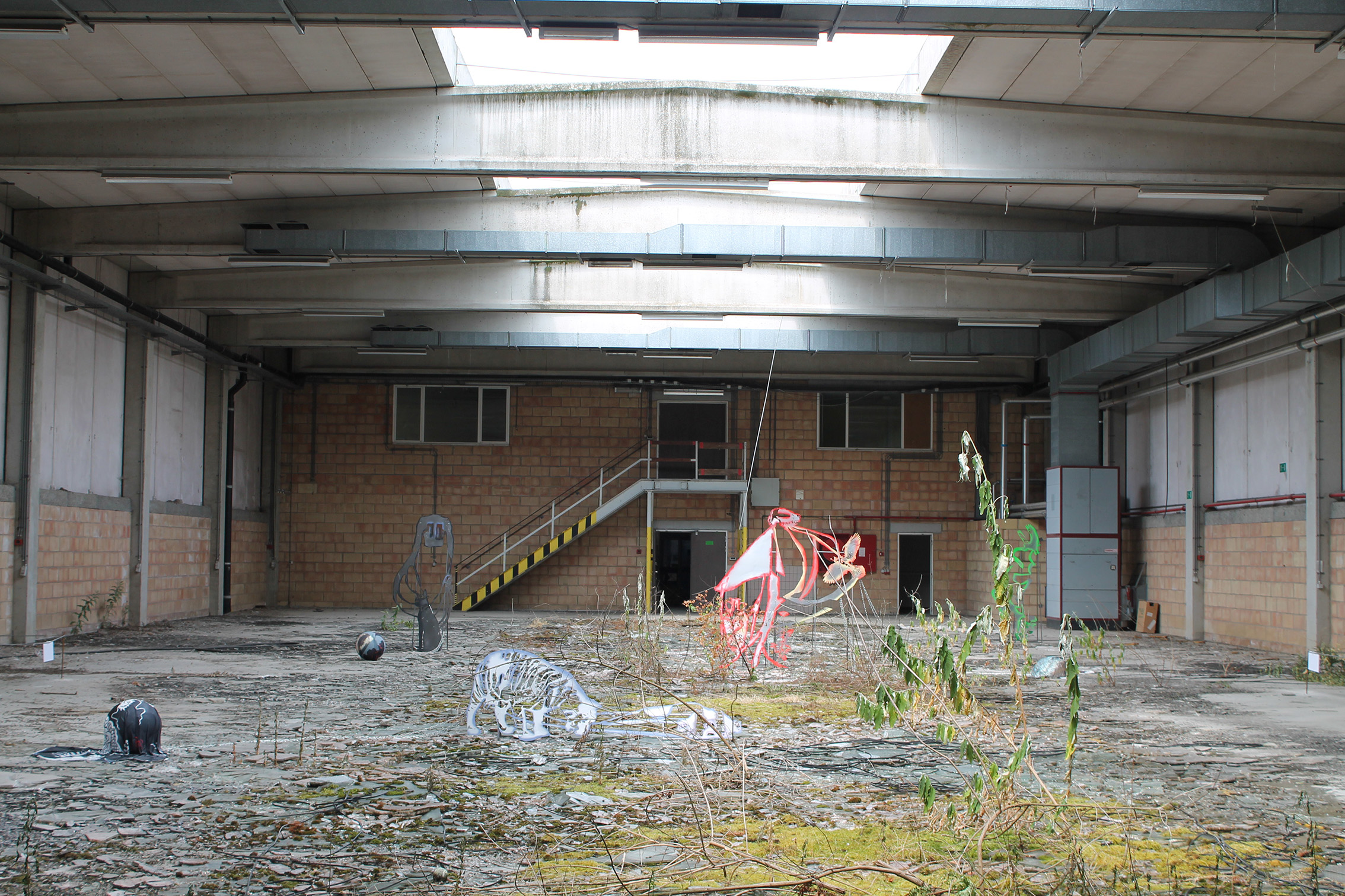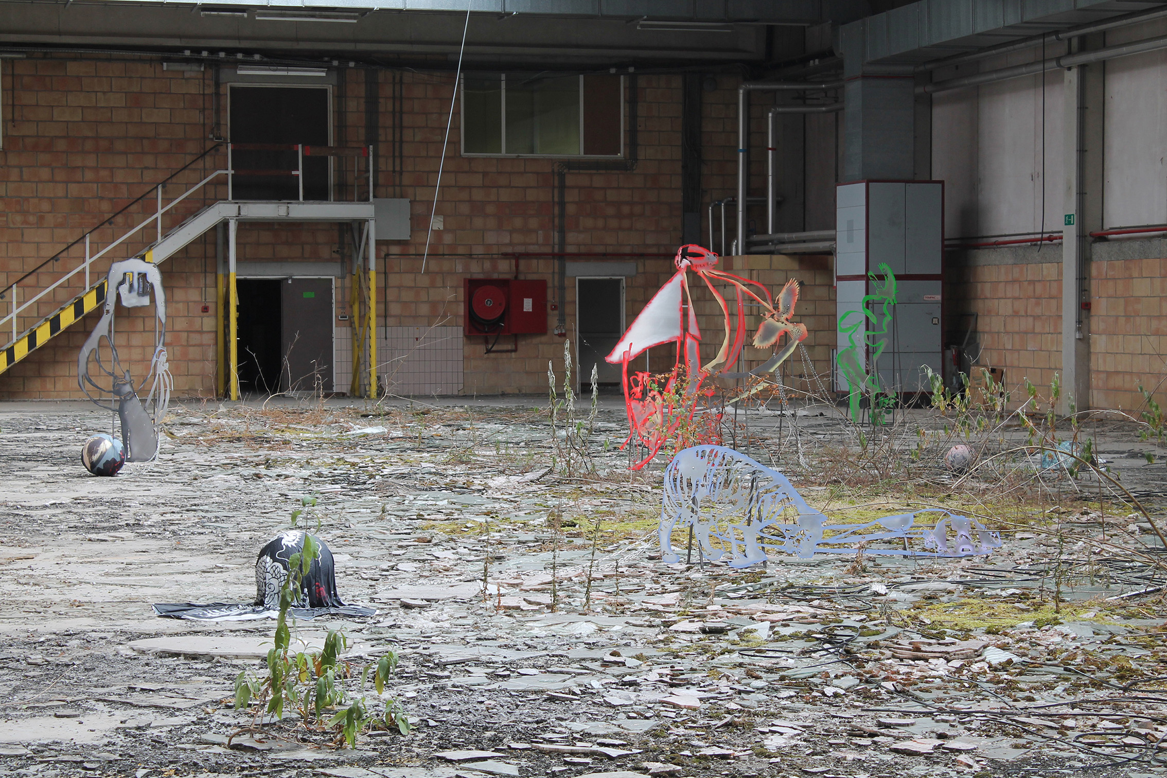 Fallen Empires and Refound DesiresCurated by Evelyn SimonsHorst Arts and MusicAsiat ex-military base, Vilvoorde - North BrusselsJuly 14 - Sep 8, 2019The practice of Lito Kattou is predominantly inspired by humanity’s longing for spirituality in a landscape informed by post-humanism and ecological crisis. Translating into an exchange between century-old belief-systems and contemporary forms of devotion, Kattou questions the holistic transverberation that is lived through a connection between geological matter and human or animal existence. She fuses analogue techniques such as for example metal welding and cutting, with digital fabrication of printed textiles, producing objects that exists as weapons, skins, cosmic elements, mythical creatures and animalistic beings. Kattou incorporates many references from literature, feminism, myths, science fiction and the history of science in her body of work, to arrive at an imagery that appears both archaeological, contemporary and futuristic. She experiments with flattened volumes to evoke both an absence as well as a presence of bodily awareness.An inside garden is being inhabited by a group of enigmatic creatures. They don’t appear alone, but carry or are themselves carried by armor-like objects. These wild animals seem to have abandoned their native landscapes, and are protecting themselves from the Sun with shields and ski-glasses. Their subdued struggle conveys and alters relationship with nature, and breath solitude. Recovering from an embodied trauma, they need to transform themselves, build a new bridge in order to be able to adapt, and coexist with each other in a mutated natural state.