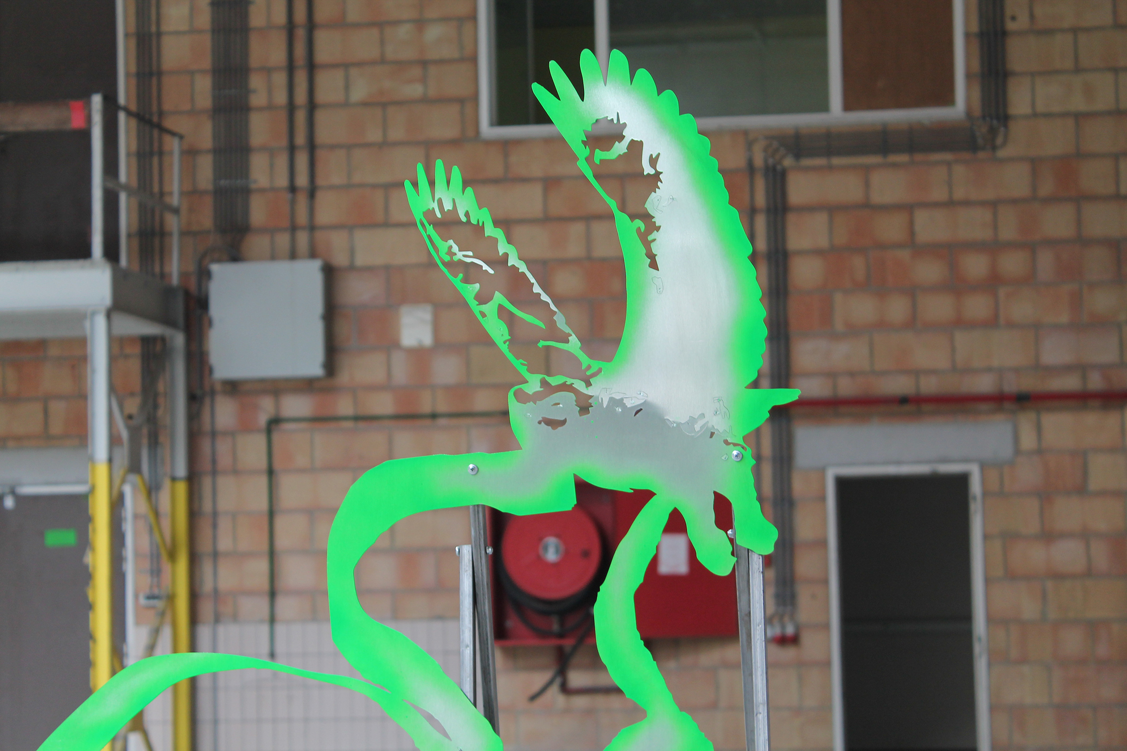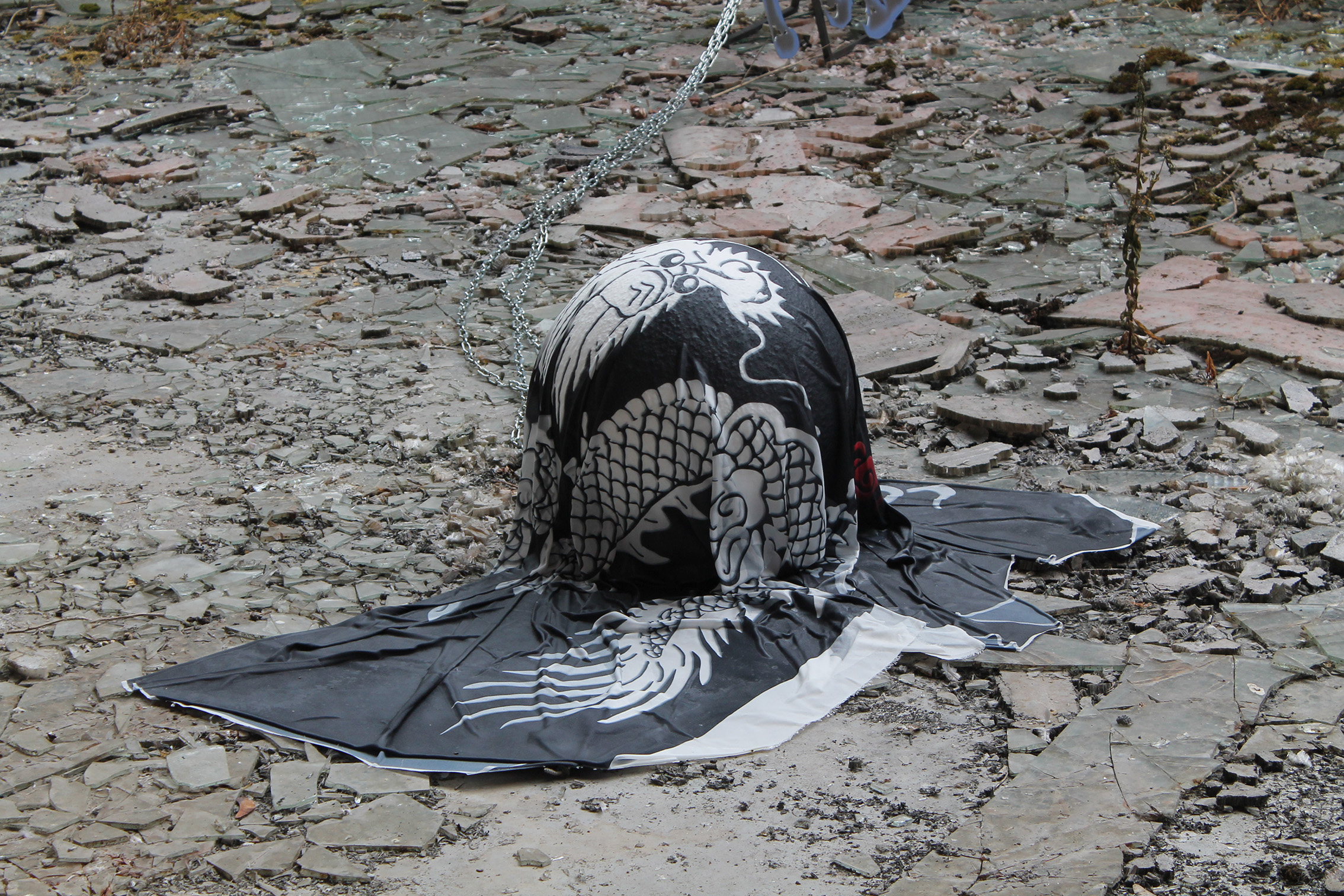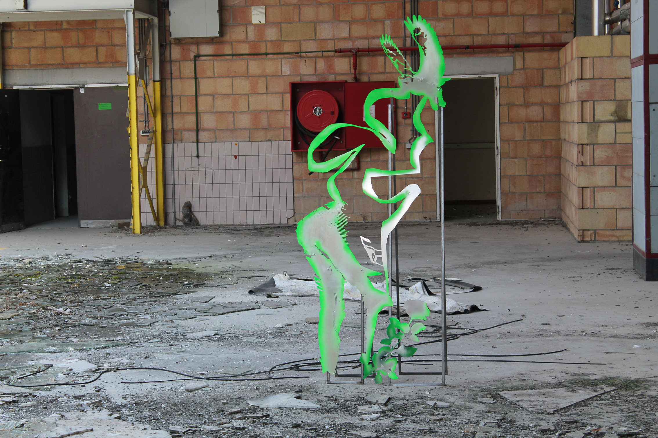 Fallen Empires and Refound DesiresCurated by Evelyn SimonsHorst Arts and MusicAsiat ex-military base, Vilvoorde - North BrusselsJuly 14 - Sep 8, 2019The practice of Lito Kattou is predominantly inspired by humanity’s longing for spirituality in a landscape informed by post-humanism and ecological crisis. Translating into an exchange between century-old belief-systems and contemporary forms of devotion, Kattou questions the holistic transverberation that is lived through a connection between geological matter and human or animal existence. She fuses analogue techniques such as for example metal welding and cutting, with digital fabrication of printed textiles, producing objects that exists as weapons, skins, cosmic elements, mythical creatures and animalistic beings. Kattou incorporates many references from literature, feminism, myths, science fiction and the history of science in her body of work, to arrive at an imagery that appears both archaeological, contemporary and futuristic. She experiments with flattened volumes to evoke both an absence as well as a presence of bodily awareness.An inside garden is being inhabited by a group of enigmatic creatures. They don’t appear alone, but carry or are themselves carried by armor-like objects. These wild animals seem to have abandoned their native landscapes, and are protecting themselves from the Sun with shields and ski-glasses. Their subdued struggle conveys and alters relationship with nature, and breath solitude. Recovering from an embodied trauma, they need to transform themselves, build a new bridge in order to be able to adapt, and coexist with each other in a mutated natural state.